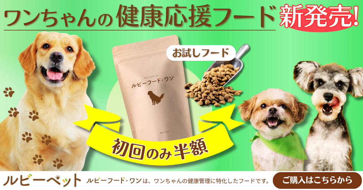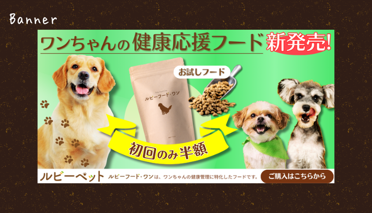 ・中央に商品画像と「初回のみ半額」の文字をリボン帯の要素と一緒に配置