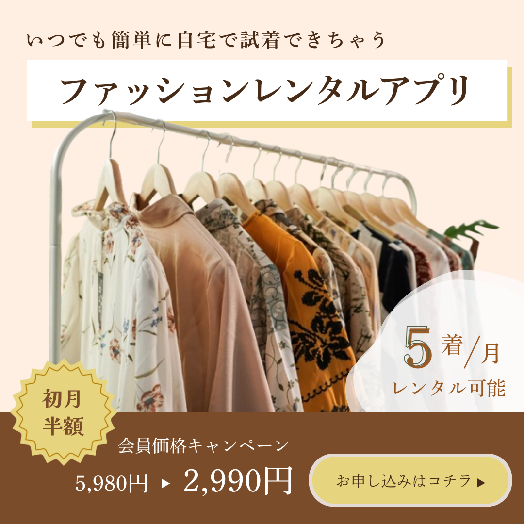 「HerTech」にて架空ファッションレンタルアプリのバナー作成。 落ち着いた雰囲気とお得感を感じるバナーを意識しております。