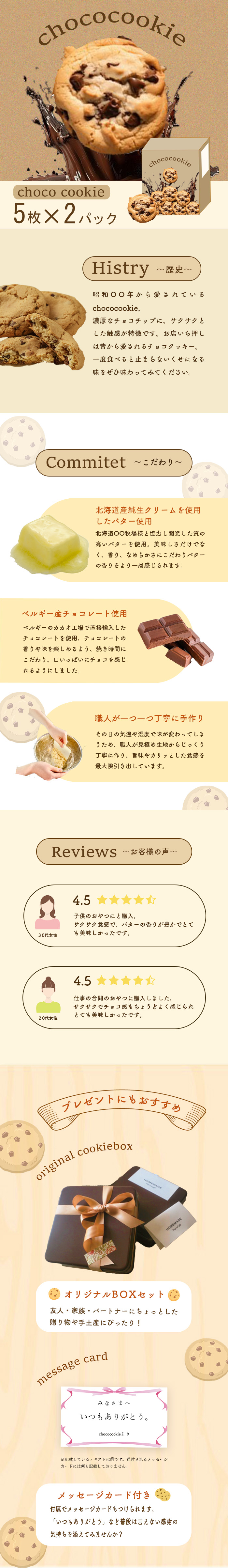 〈想定する顧客〉チョコレートクッキーを販売している会社(架空)〈要望〉楽天に記載するLPの制作。クッキーのこだわりが伝わるようなデザインにしてほしい。
