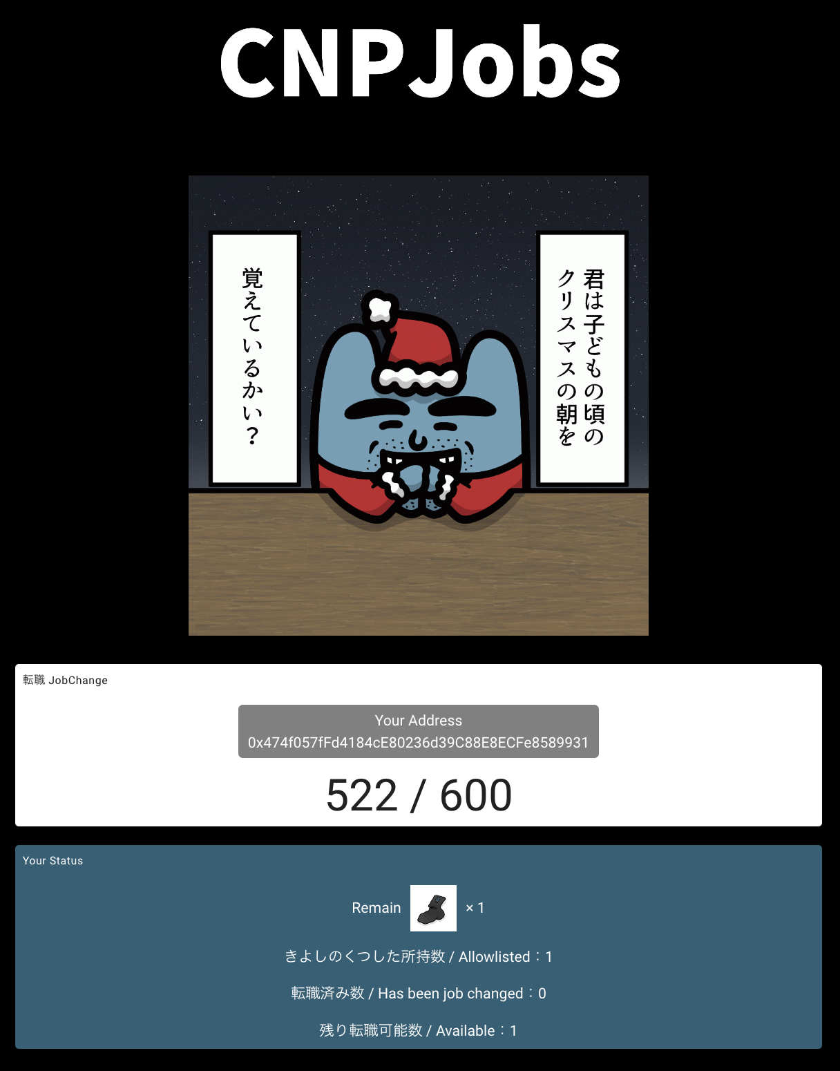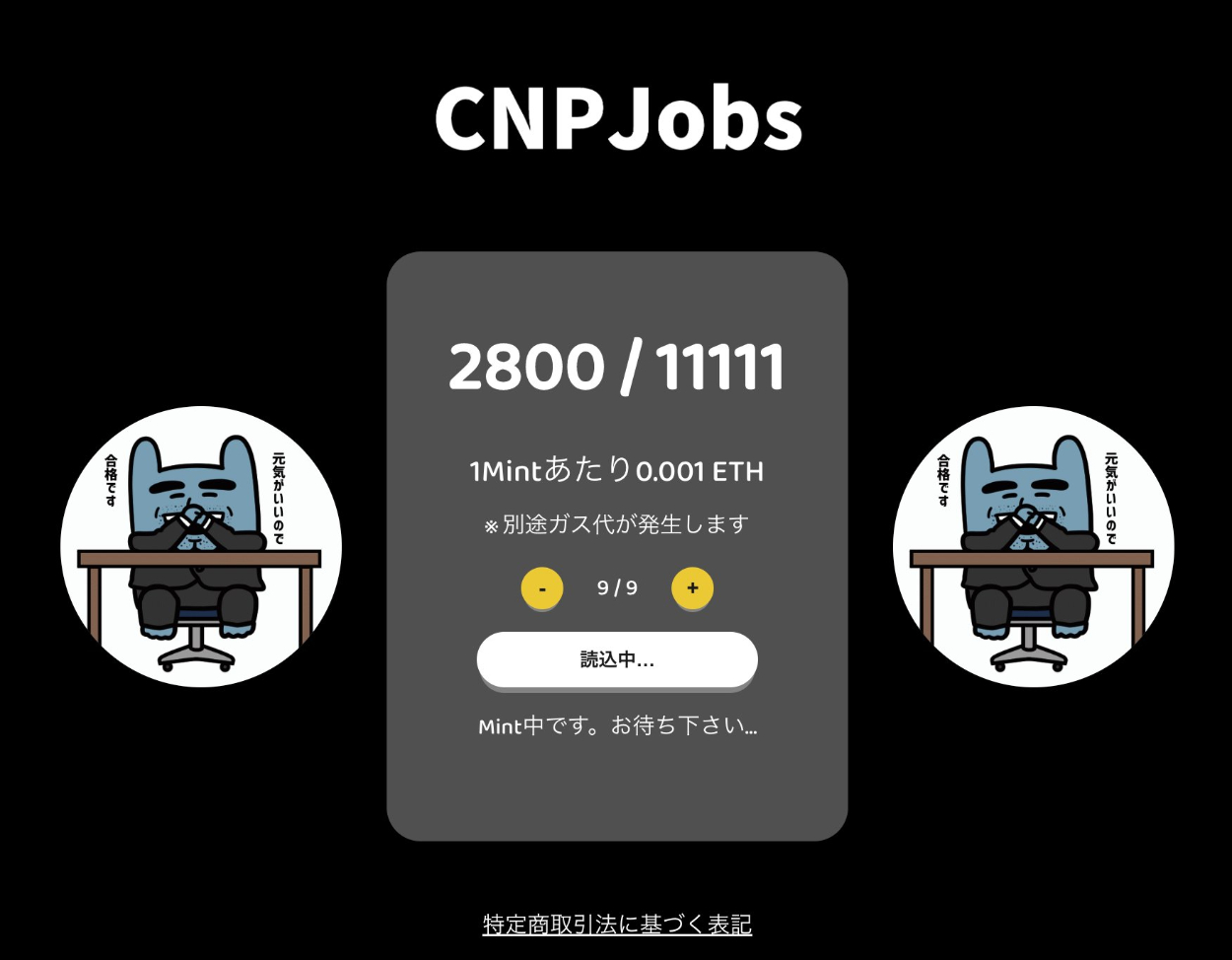 NFTプロジェクトであるCNP Jobsのコントラクト開発、ジェネラティブデータ生成、ミントサイト構築を担当しています。現在も継続開発中