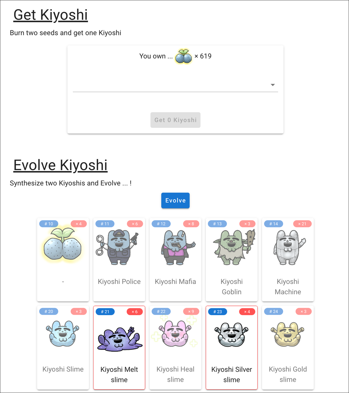 - "きよしの種"というNFTを2つバーンするとランダムで1つのキャラクターを入手
