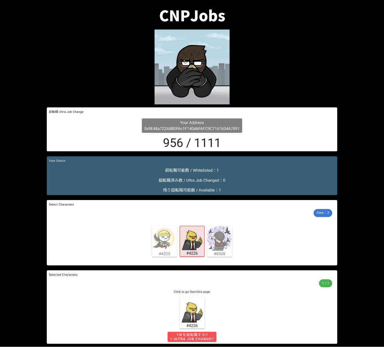 - 所持しているNFTを一覧表示、バーン対象を選択して超転職を行うサイトを構築