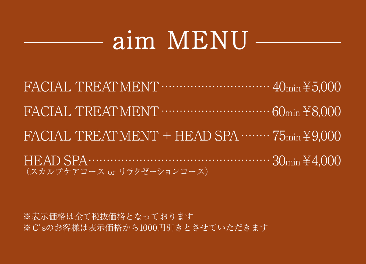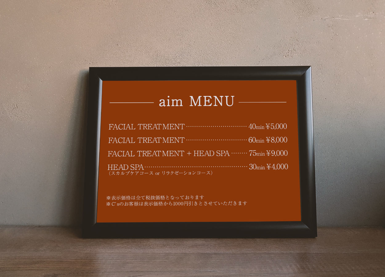 【実案件】フェイシャルエステ&ヘッドスパサロン aim 様 メニュー表