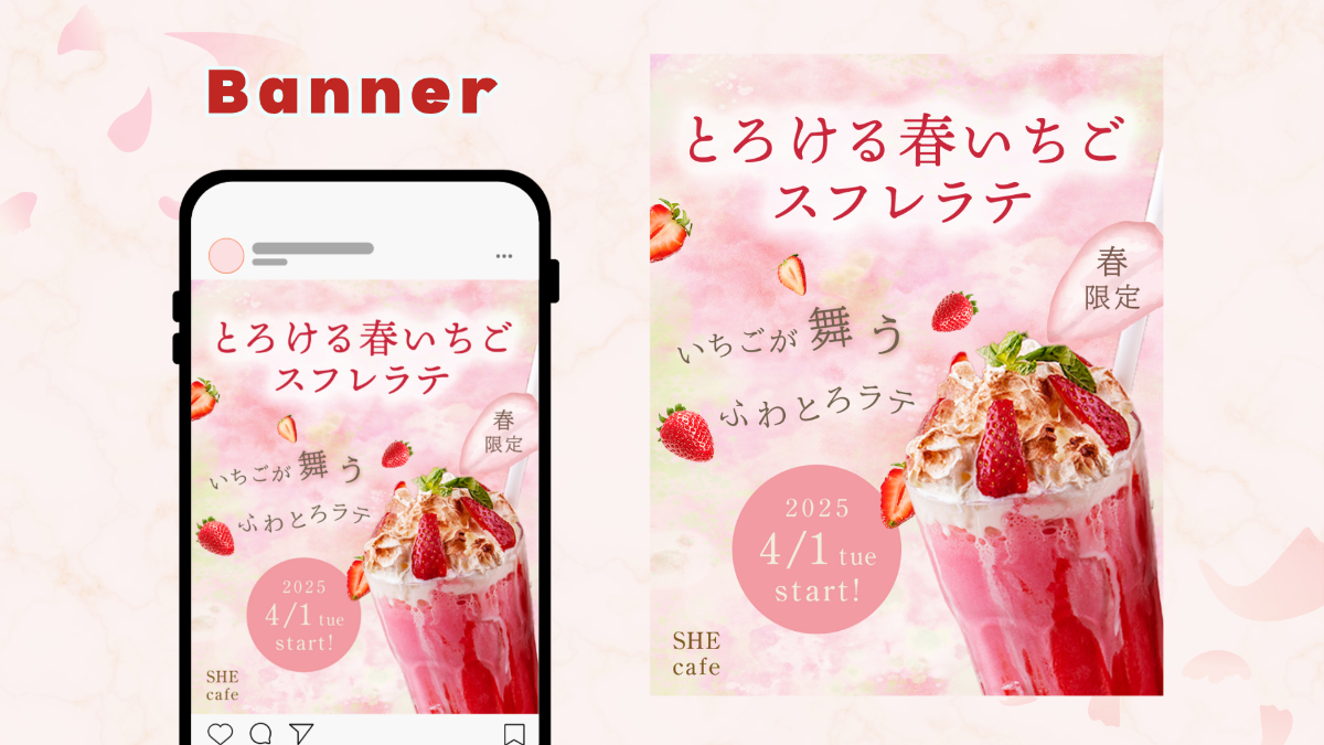 - 「いちごが舞う」とうキャッチコピーやいちごが舞っているように見せることで春の軽やかさを表現しました。