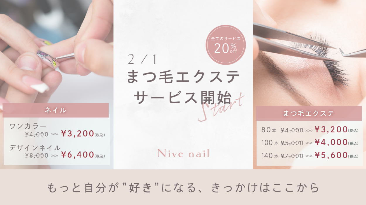 - 左側にネイル施術の画像、右側にマツエク施術の画像 を配置することで、新サービスのマツエク開始に伴う両方のサービスの割引が一目で伝わるように設計しました。