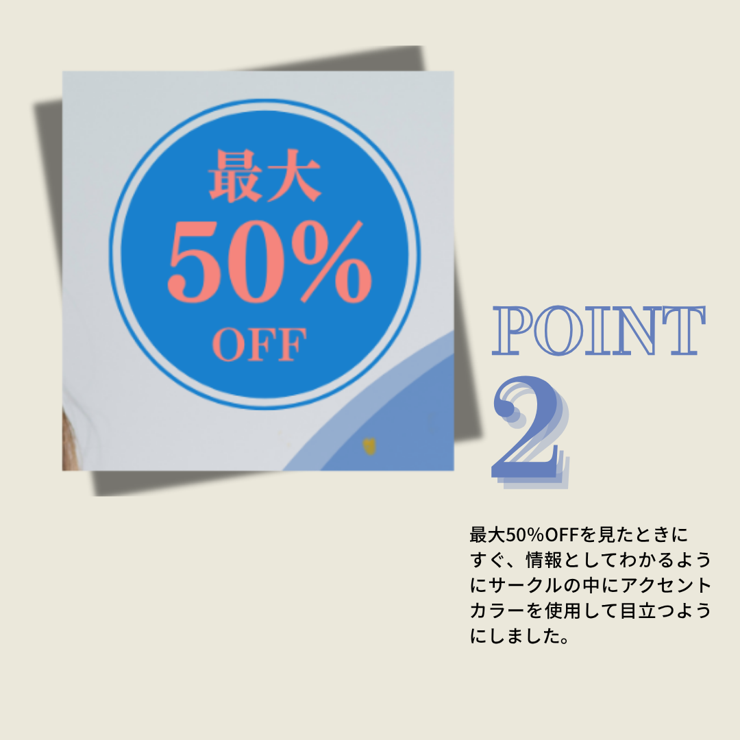 目玉の最大50%OFFを目立たせるよう意識するようにしました。
