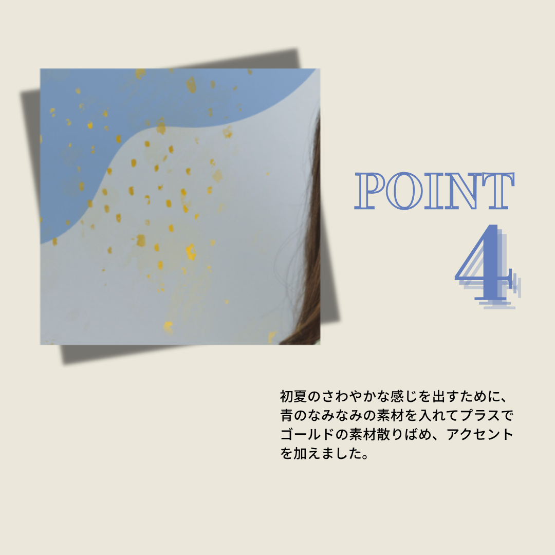 →初夏を感じるというところから、全体的に青で統一し黄色やオレンジなどの色味で、