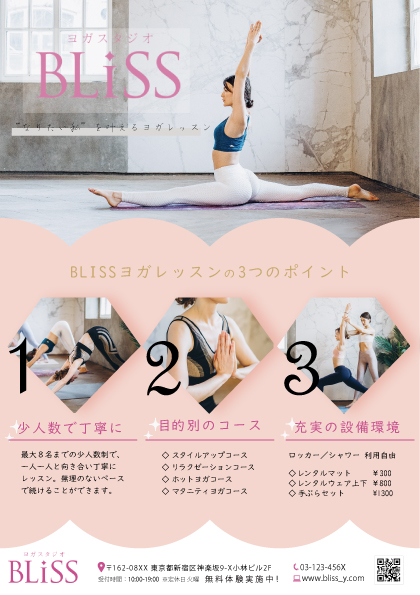 ターゲットは20代~30代の女性。ヨガ教室に興味のある人は日常生活の緊張から解き放たれ心身共にリフレッシュすることが目的ではないかと予想し、ヨガ特有の柔らかく伸び、リラックスしたイメージと清潔感を感じられるように意識した。トーンの高い色を広く使用し、曲線を用いることで柔らかい雰囲気を演出、充実感や非日常的な特別感をフォントやアイコンで演出した。
