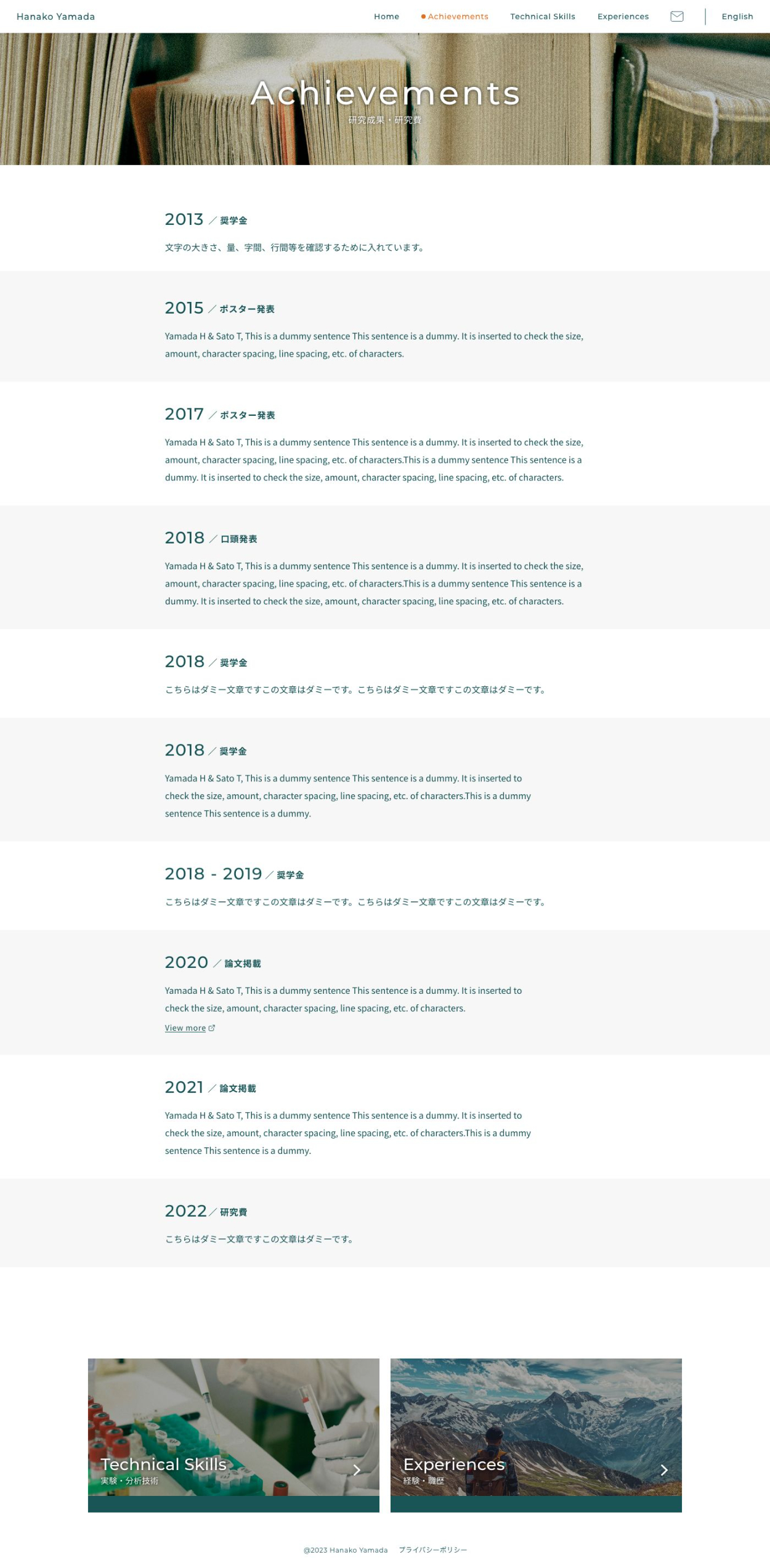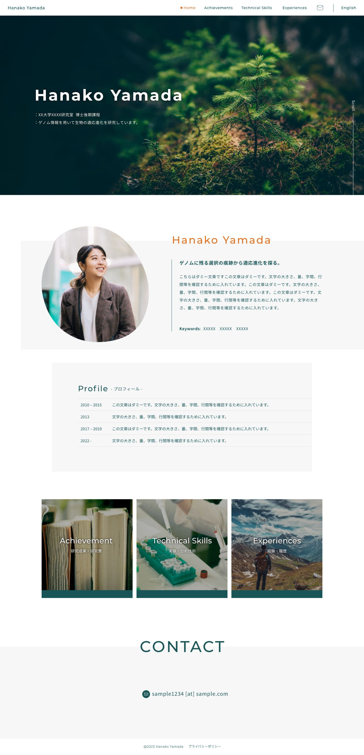 大学院で研究を行なっている方の個人サイトを作成しました。研究内容や実績を伝えるだけでなく、本人の人となりや雰囲気が伝わるようデザインしました。