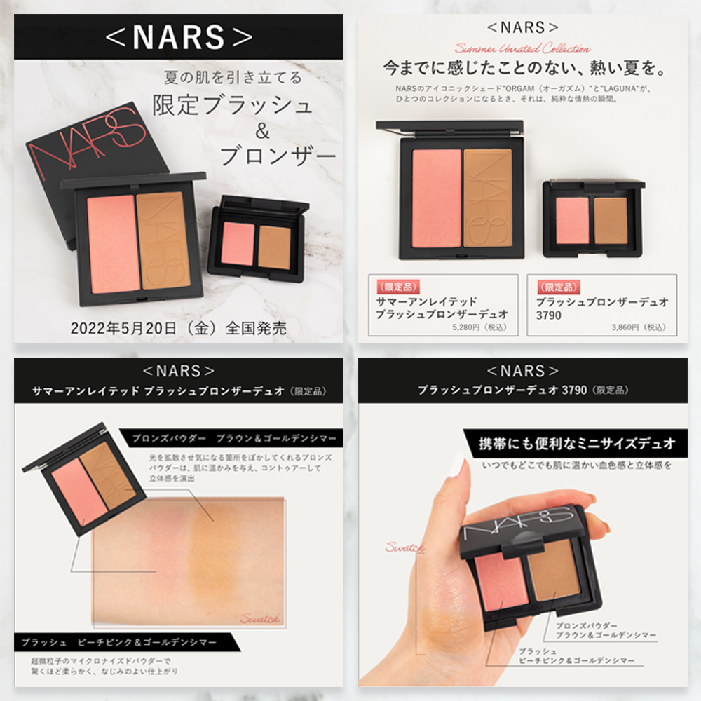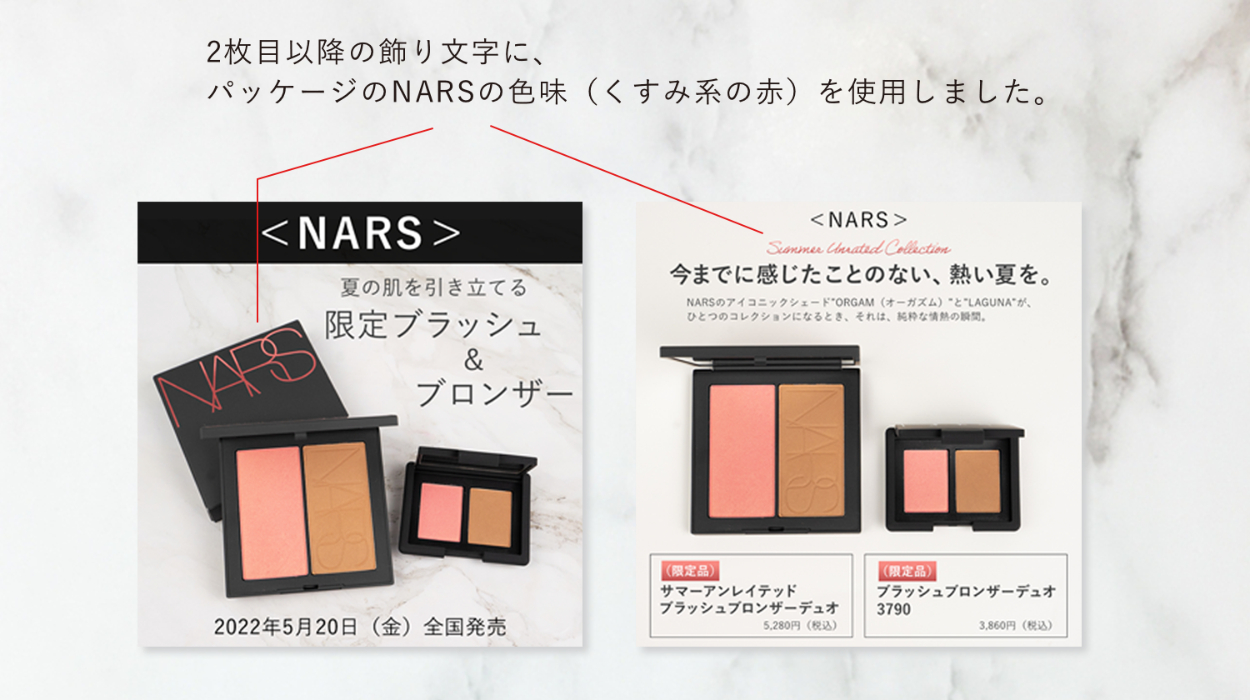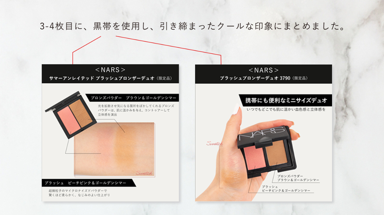 【制作実績】三越伊勢丹様 SNSバナー制作 みさこ 管理栄養士 × デザイナー OVERVIEW 三越伊勢丹様 化粧品オンラインストア meeco(ミーコ)Instagramバナー制作 YEAR 2022 掲載はこちら<制作のポイント>2枚目以降の飾り文字に、パッケージのNARSの色味(くすみ系の赤)を使用しました。3-4枚目に、黒帯を使用し、引き締まったクールな印象にまとめました。 WEBSITE