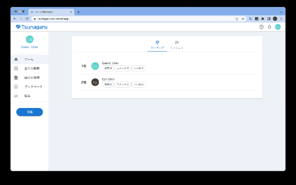 - ランキング機能:投稿した数や投稿に対するアクションの数でランキングを表示する機能。