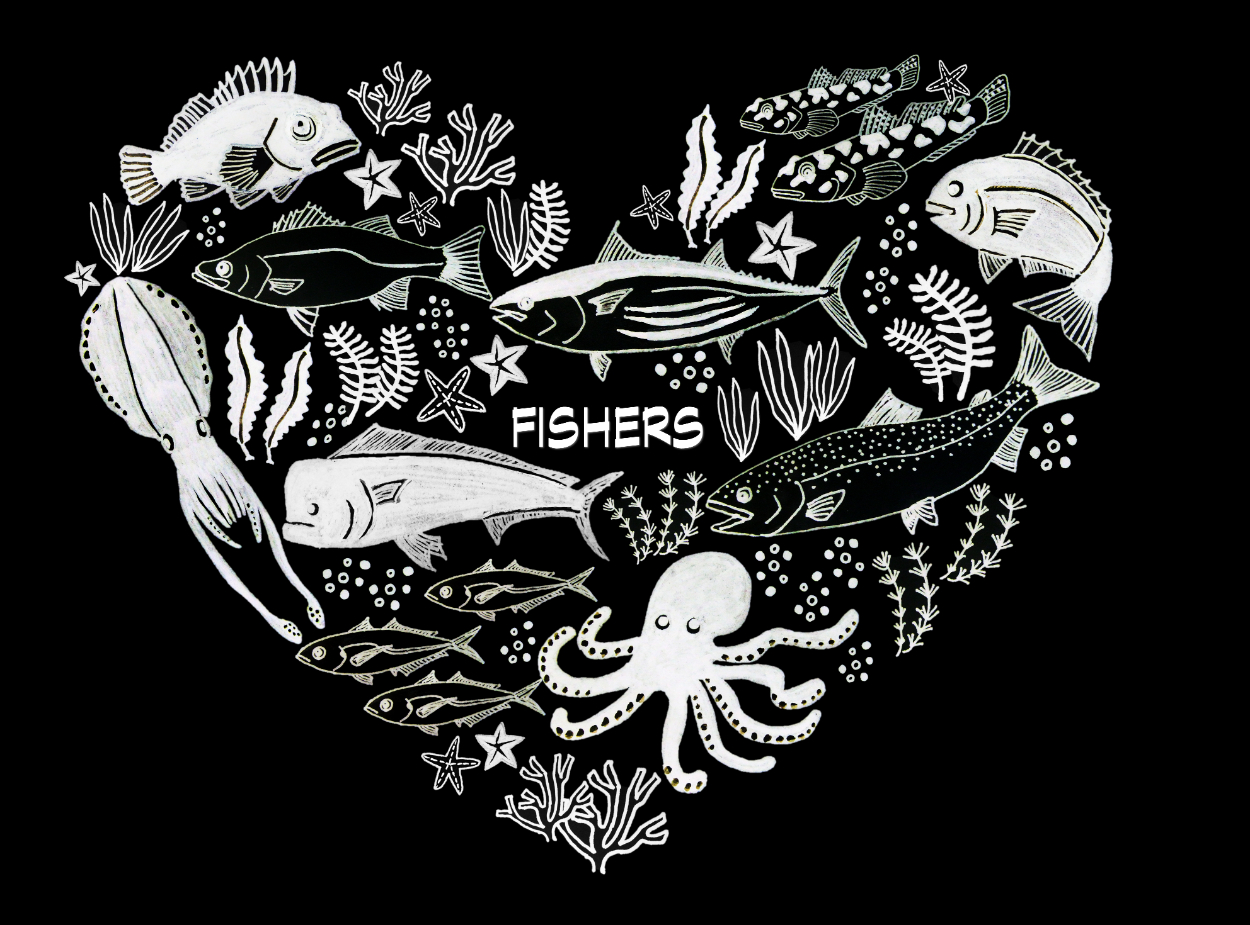 Tシャツデザイン(魚釣りサークル) Moe.Y 学生 OVERVIEW 大学で、FISHERSという魚釣りサークルのTシャツをデザインしました YEAR 2017 背中部分の柄今までにメンバーが釣った魚などを、♡の形に配置しまし、魚への愛を表現しました。黒いTシャツの背中部分に印刷したイラストです。胸元のワンポイントサークル名を、魚の骨をイメージしてロゴにしました。