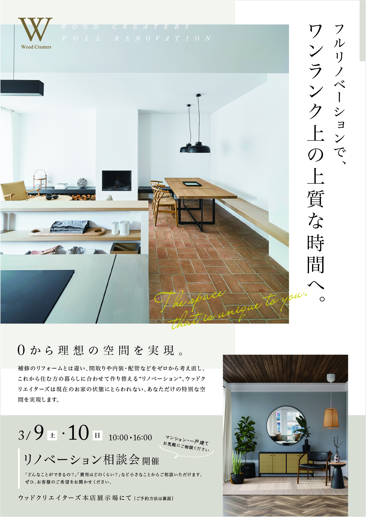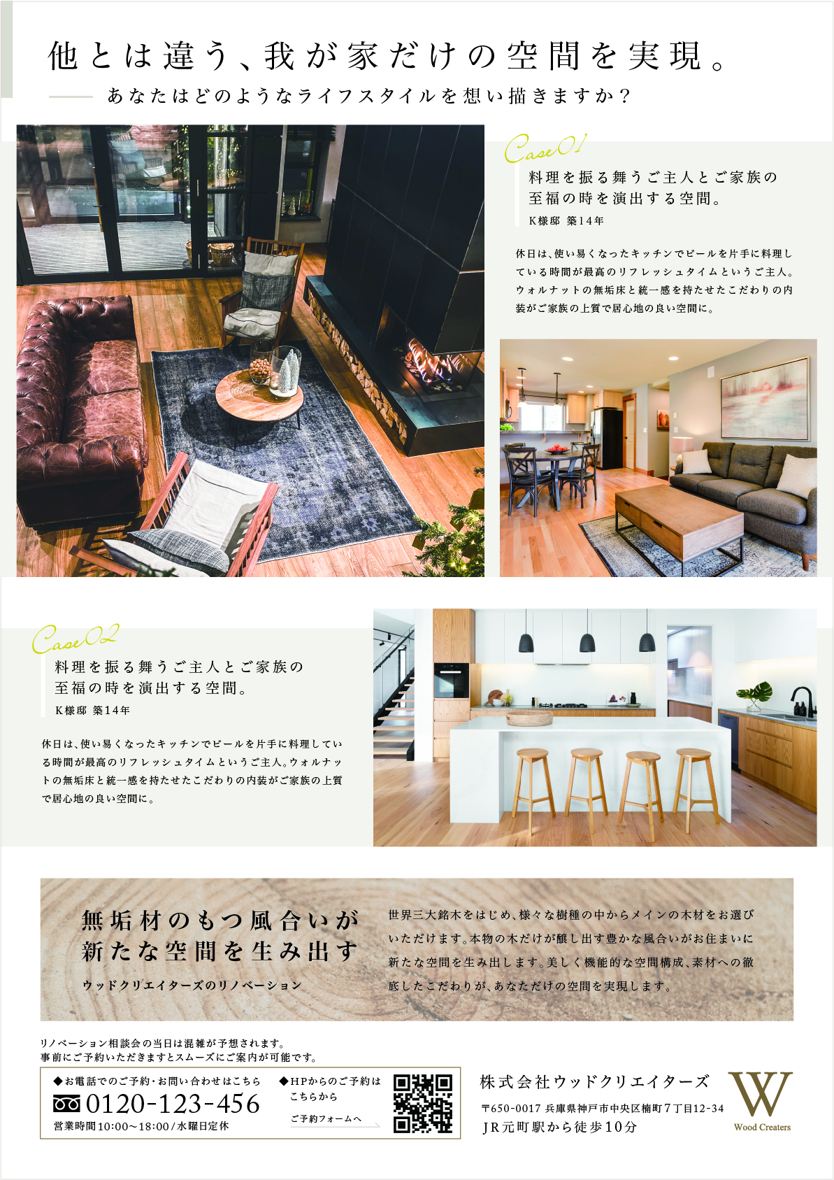 デザイン|リノベーション相談会の告知DM かじわら WEB・印刷物デザイン OVERVIEW 架空のリフォーム会社のDMを作成しました。写真が映える&品質の良さが伝わるデザインを目指しました。サイズ:A4両面 YEAR 2022 写真が映えるようにホワイトを基調とした配色にしました。上質な印象を感じてもらえるよう、フォントは明朝体を使用、余白を意識してデザインしました。