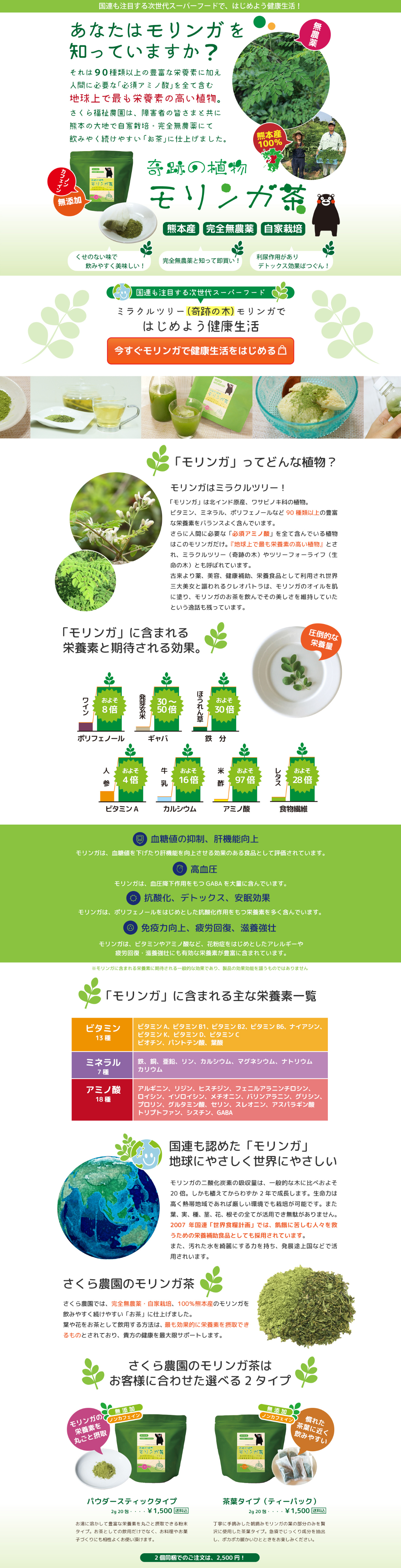 障がい者の社会への自立を支援するさくら福祉会さまが手掛ける、国連も注目するスーパーフード、モリンガの周知と健康食品「お茶」の販売の為のランディングページ。