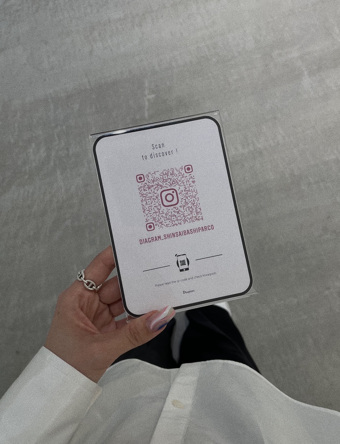 目的:Instagramのアカウントを気軽にフォローして頂けるよう作成致しました。店舗に馴染む事を意識しながらシンプルに、重要なQRコードは色をつけ視覚に入ってきやすいよう作成致しました。
