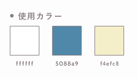 - 落ち着き、大人な凛とした女性をイメージし深い青をメインカラーに設定しました。ベースカラーは洗練されたイメージと明度が低い写真が際立つように白色、アクセントは、青色の反対色で柔らかく、前向きなイメージにつながるようペールトーンに近い黄色を選びました。