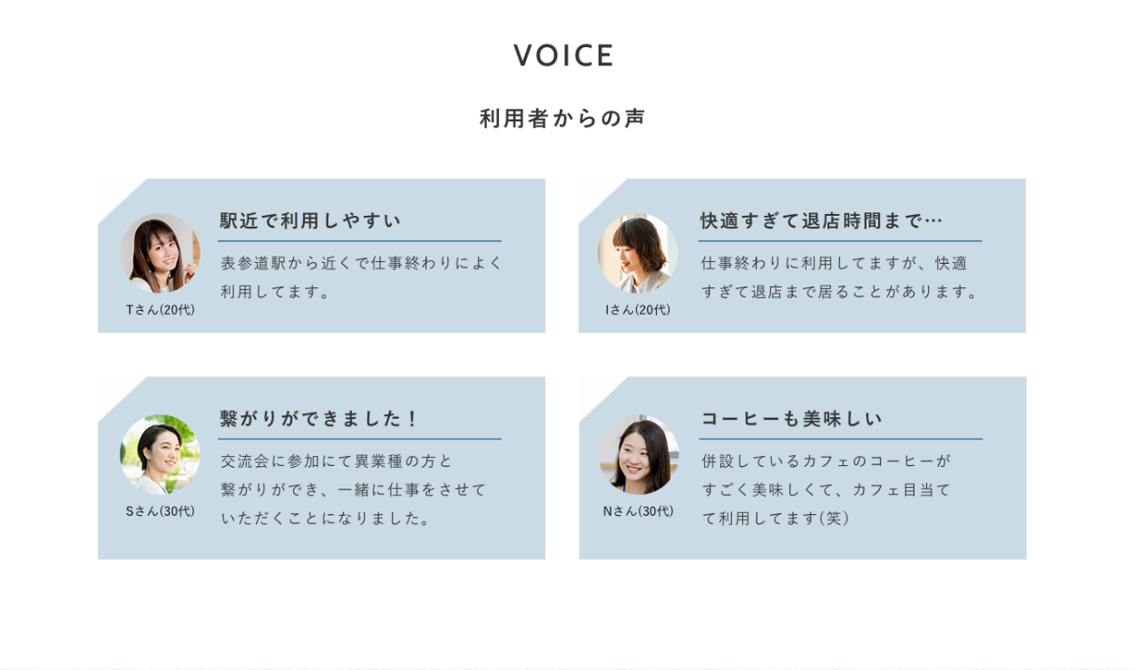 - コンセプトの後に“実際に使っている方の口コミ”の項目を追加しました。口コミを見てもらうことで、「自分だったらこんなときに利用しようかな?」とイメージしてもらいたかったからです。