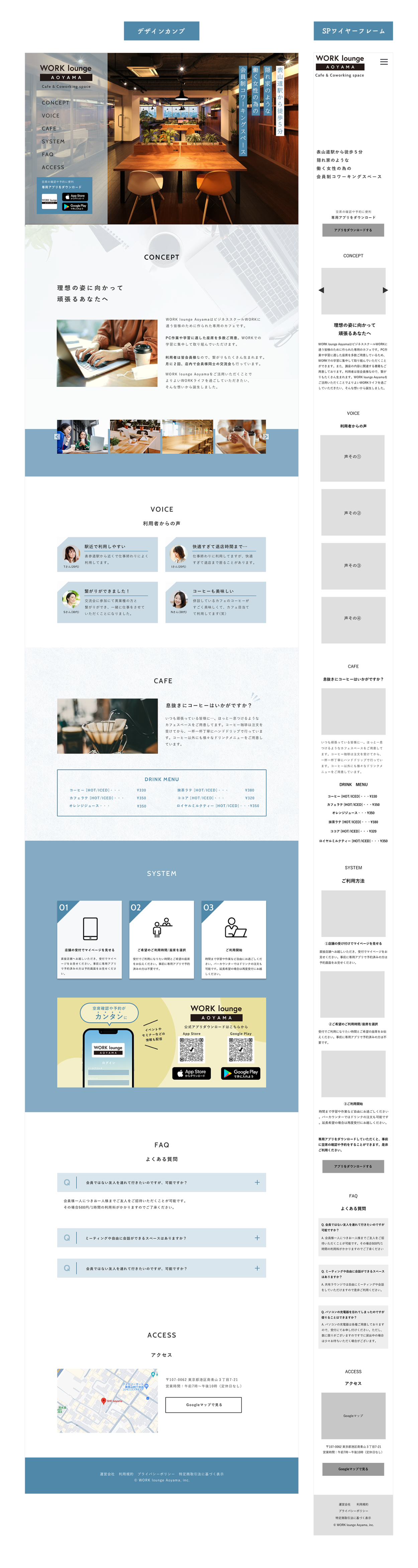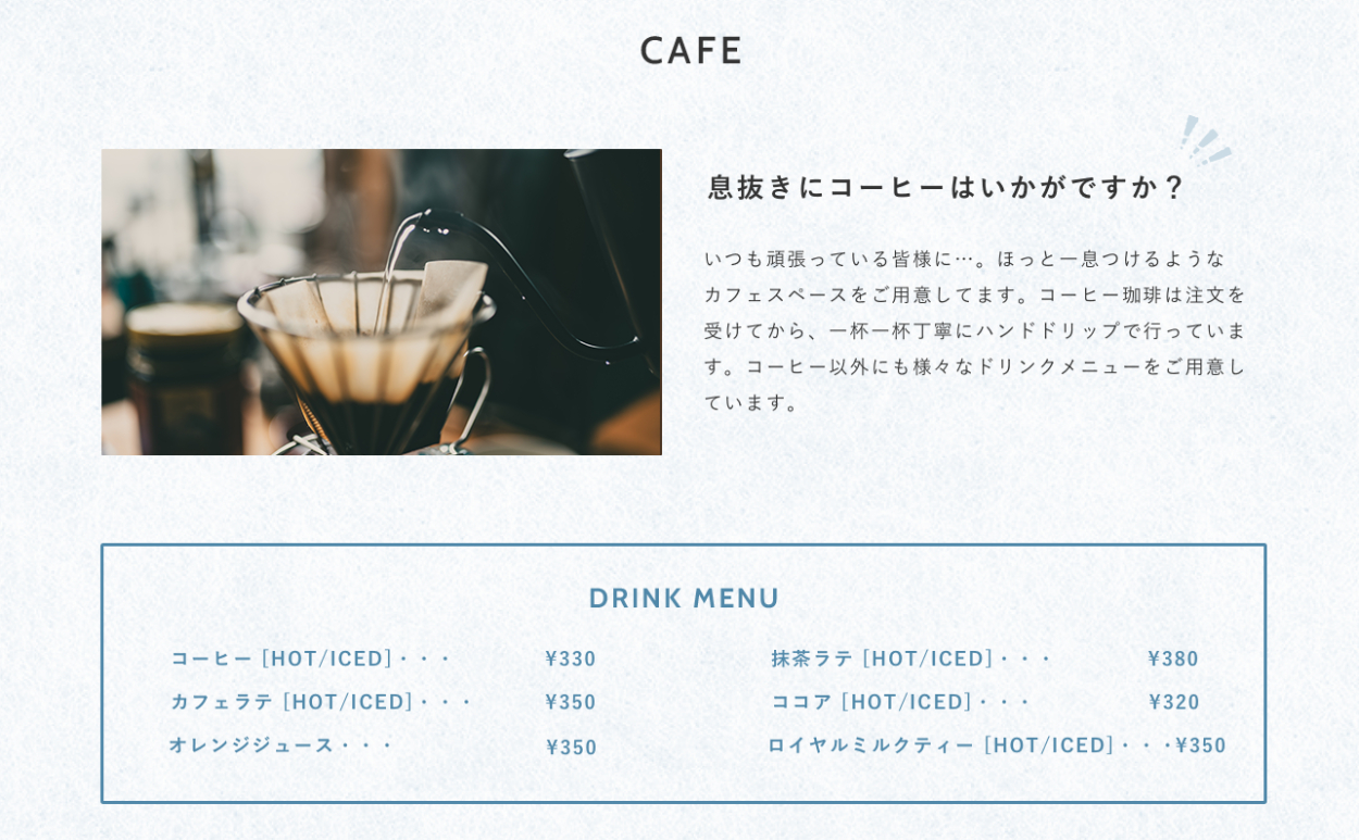 - ワイヤーフレームでは”ドリンクメニュー“となっていた項目を”カフェスペース“の紹介へ変更しました。作業の合間にひといきつけるようなキャッチコピーと、寒色でまとめられている中でもぬくもりが感じられるように、背景は紙のテクスチャを使用しました。