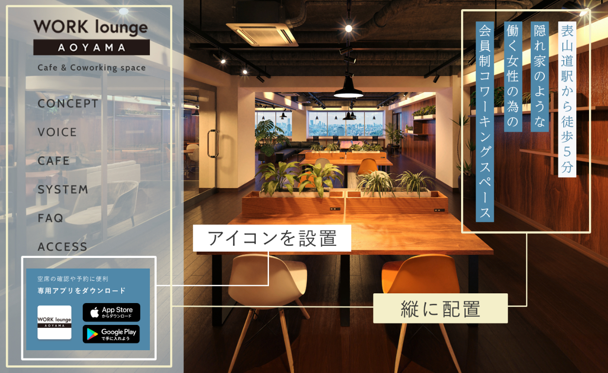 「しなやかで凛とした女性が、落ち着きのある空間でスキルを磨いたり、同じ価値観を持つ仲間と出会う」をコンセプトに作成しました。利用する時間帯は仕事終わりの夜をイメージしている為、使用している写真は明度が低めに調整しています。