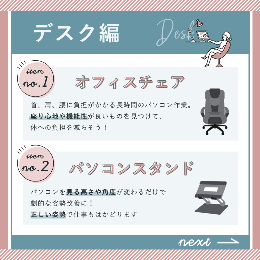 2−4枚めでは実際のアイテムの紹介をし、テーマ別の大見出し、小見出し、説明書という構成にし、見やすさを意識しました。