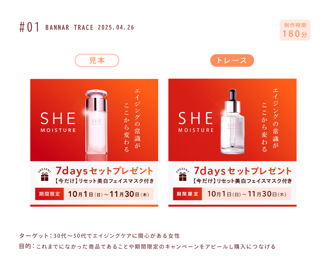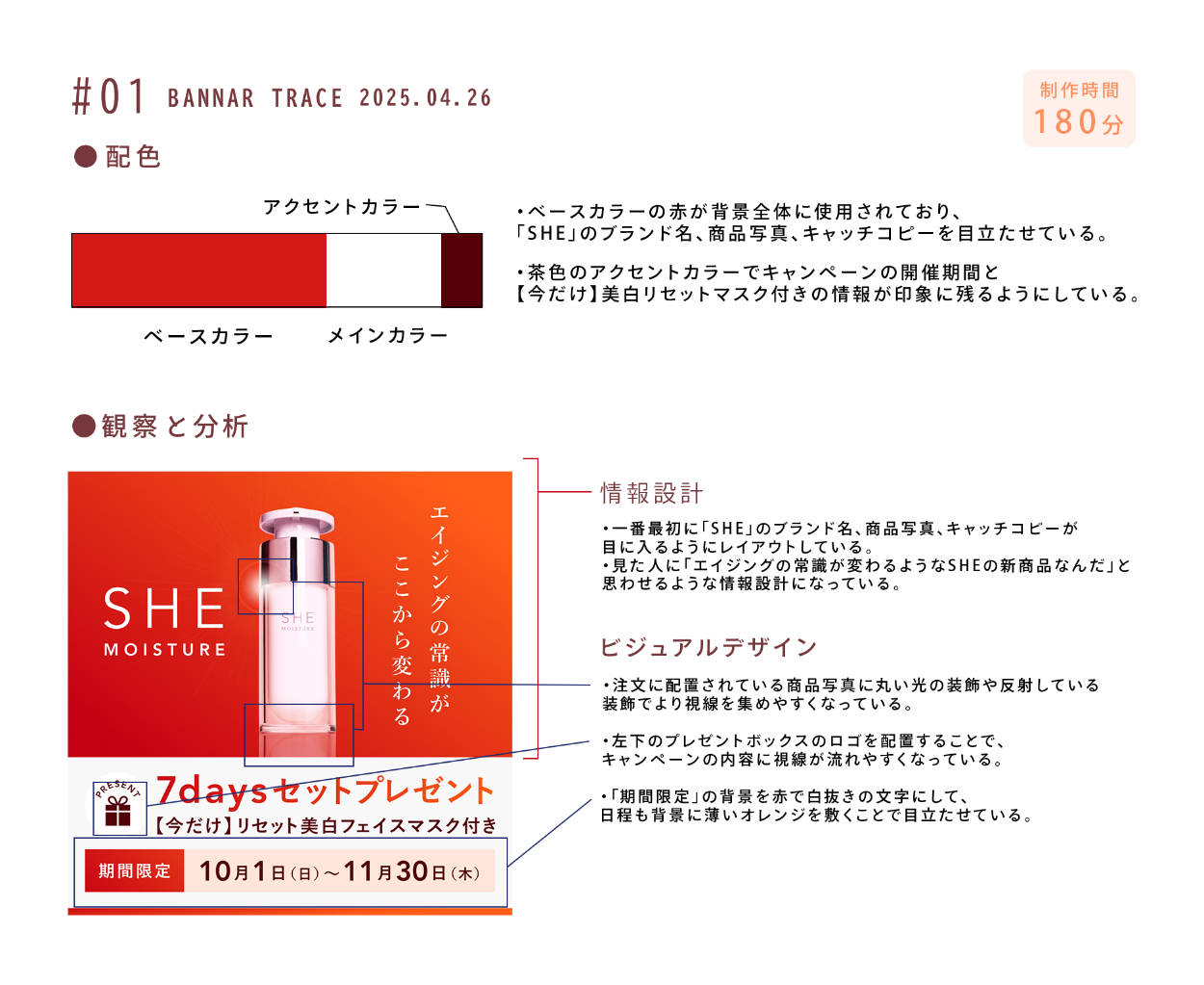 SHElikes PRO デザイナーの課題 でバナートレースに取り組みました。 ターゲットや目的、配色・情報設計・ビジュアルデザインの分析も行いました。 使用ツール:Photoshop