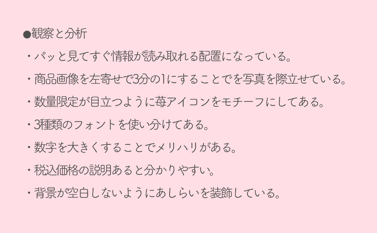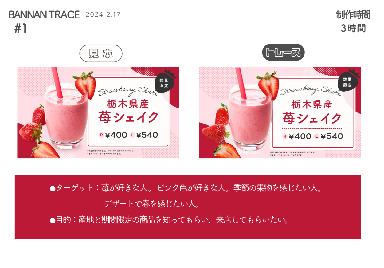 【課題制作】 SHElikes マルチクリエイターコースデザイン実践課題① お題に沿ったバナートレース、観察・分析内容のまとめを作成しました。 [制作期間:3時間/使用ツール:Photoshop]