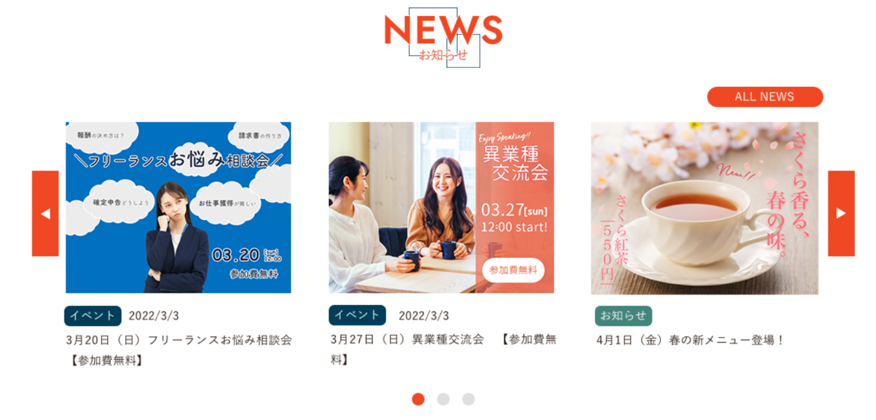 ペルソナが人とのつながりを求めていたので、イベント情報は重要と考えました。そこで、イベントごとに目を引き、参加したいと思ってもらえるようなサムネイルを作成しました。また、ニュースセクションは、イベントとお知らせの2つを載せたいと思ったので、イベントはネイビー、お知らせはグリーンとタグの色分けを色でもなにの情報かぱっとわかりやすくしました。