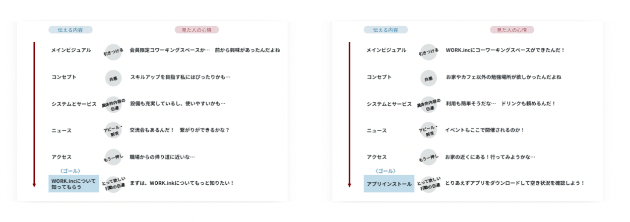 クライアントの目的「WORK lounge AOYAMAについて知ってもらう」について、ターゲット別にゴールを設定しました。また、ターゲットごとのユーザーストーリーも考えました。