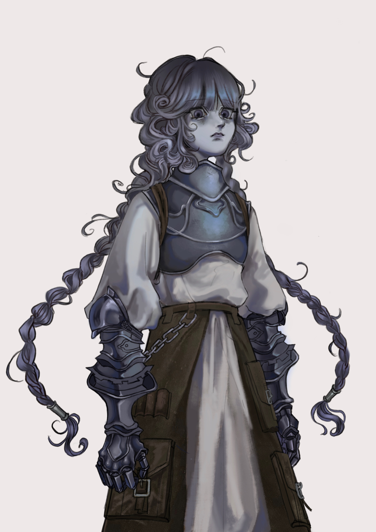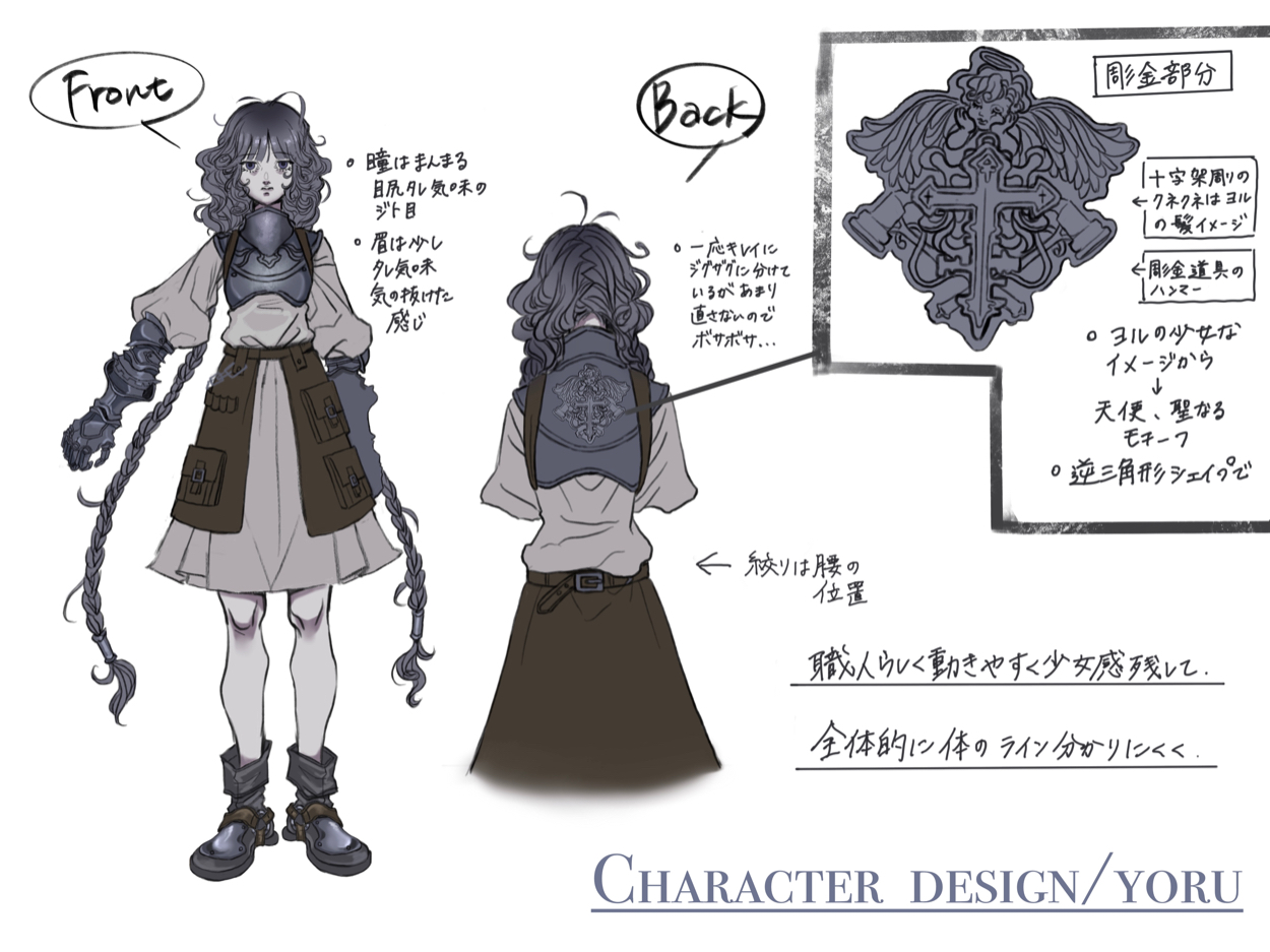 極度の冷え性ということで全体的に寒色でまとめてデザインしてみました。そして職人のキャラクターなので革のエプロンや質素なワンピースなど無骨でシンプルな服にこだわりました。その反面彫金師という設定を活かすために腕のガントレットや胸部の鎧などは細かなディテールと滑らかな曲線を活かして目立つよう工夫しています。