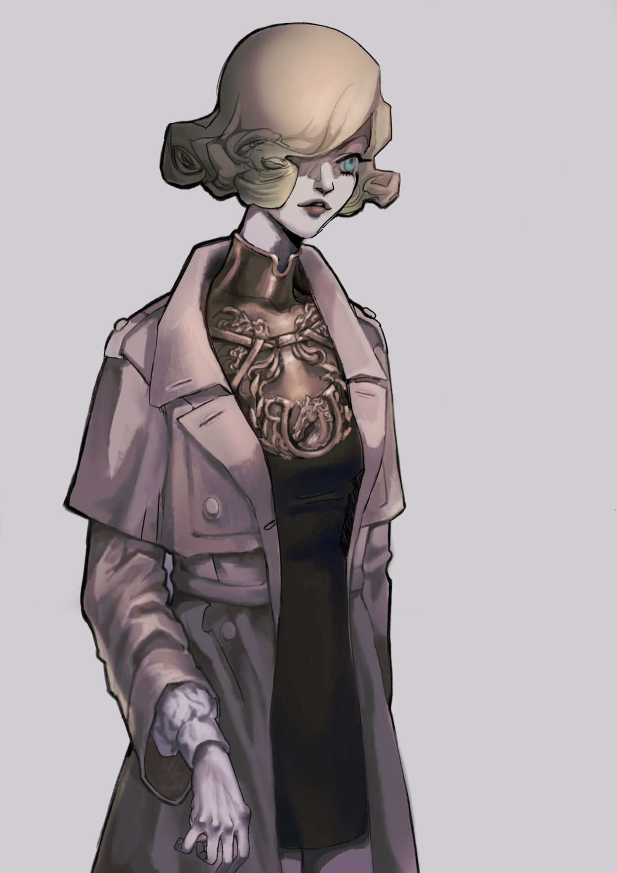 華美な雰囲気にならないようにシンプルな黒のワンピースにシンプルながら上品さを併せ持ったトレンチという洗練されたシルエットにこだわりました。胸のプレートは友人であるヨルがチェルシーをイメージして贈ったもので、馬のモチーフで男性らしくかつ上品であるようにと考えてデザインしました。