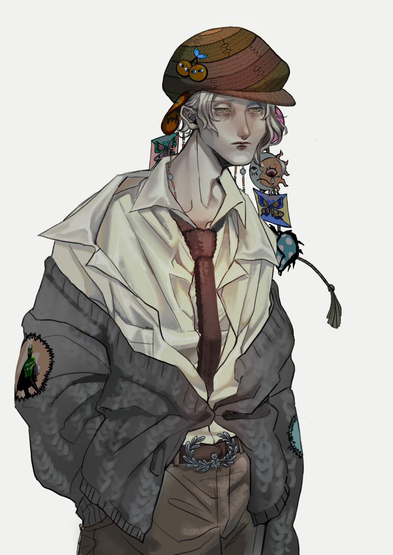 幼少期にトラウマを持っている街の帽子屋の男性のキャラクター。気弱で常に孤独を感じている。気弱さや何処か迷ってる雰囲気を出すために自信のない立ち方や表情を意識してデザインしました。パニックを起こすと少し子供っぽくなってしまうのでそんな無邪気さをワッペンやビーズなどのポップなモチーフで表現してみました。