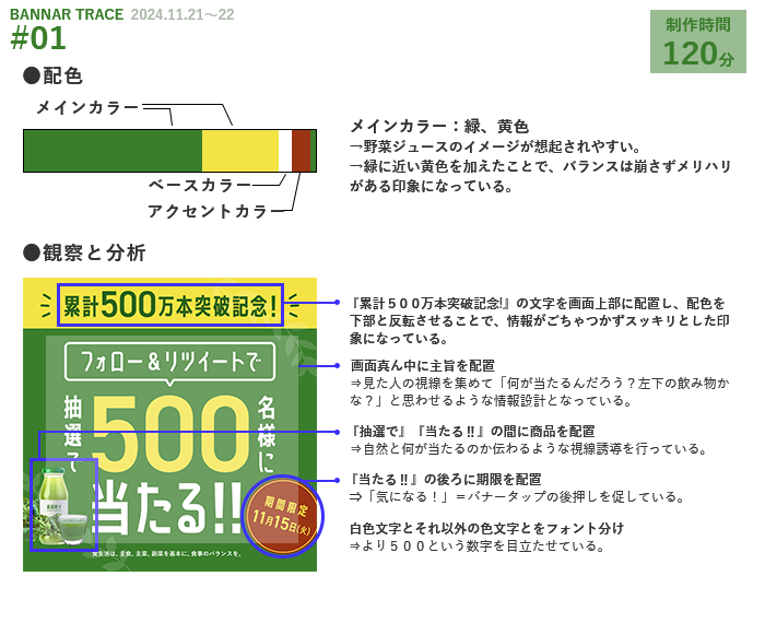 ・”抽選で”当たる!”の間(左下)に野菜ジュースを配置し、それが景品であることを
