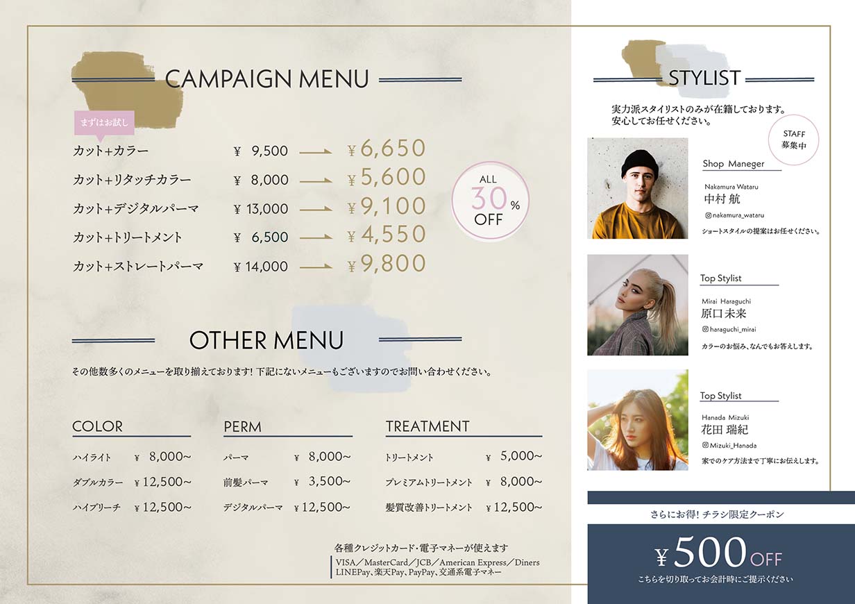 裏面では、線のあしらいで項目ごとに区切り、余白を充分に保つことで視認性を確保。「確かな腕のスタイリスト」であることを示すために、スタイリストの個人のインスタグラムのIDを掲載。スタイリストの過去の経歴を、より詳細に調べられるようにしました。また、メニューの箇所では特におすすめのメニューを提案する事で、選択のストレスを減らす工夫を行いました。同様に、スタイリストが最も得意とする事を一文掲載し、自身の悩みに合うスタイリストを選択しやすいようにしました。