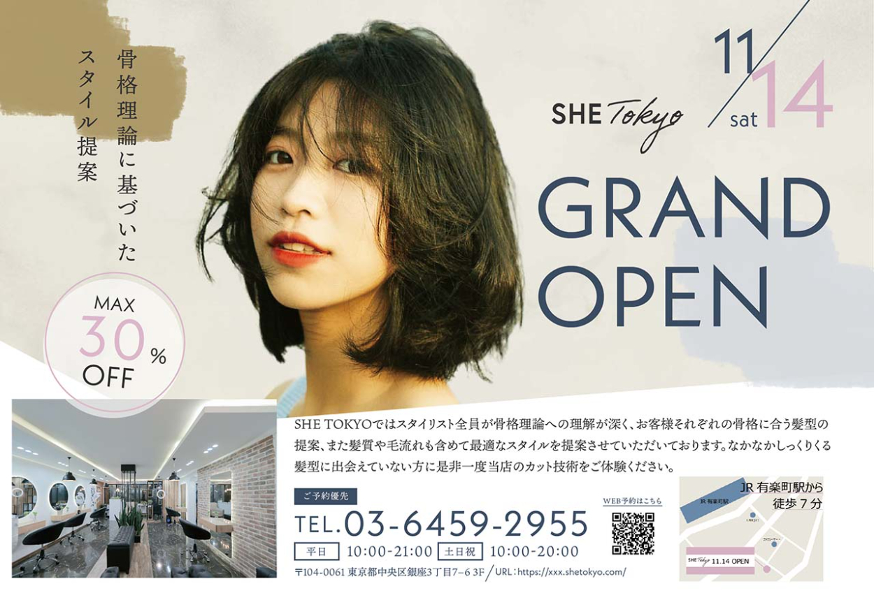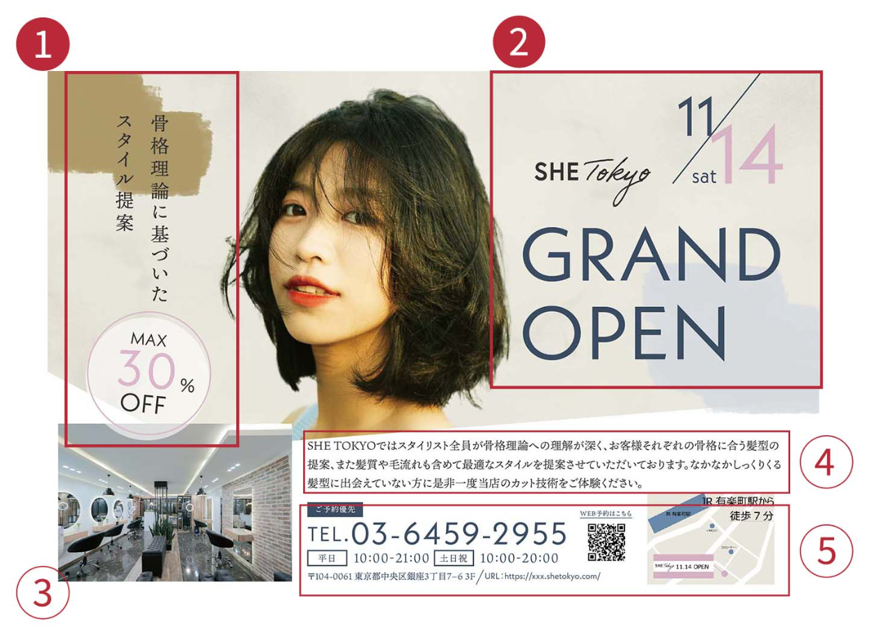 ②.店名、グランドオープン、オープン日時をひとかたまりに配置▶一目で必要な情報を伝え、新規顧客獲得に繋げる。