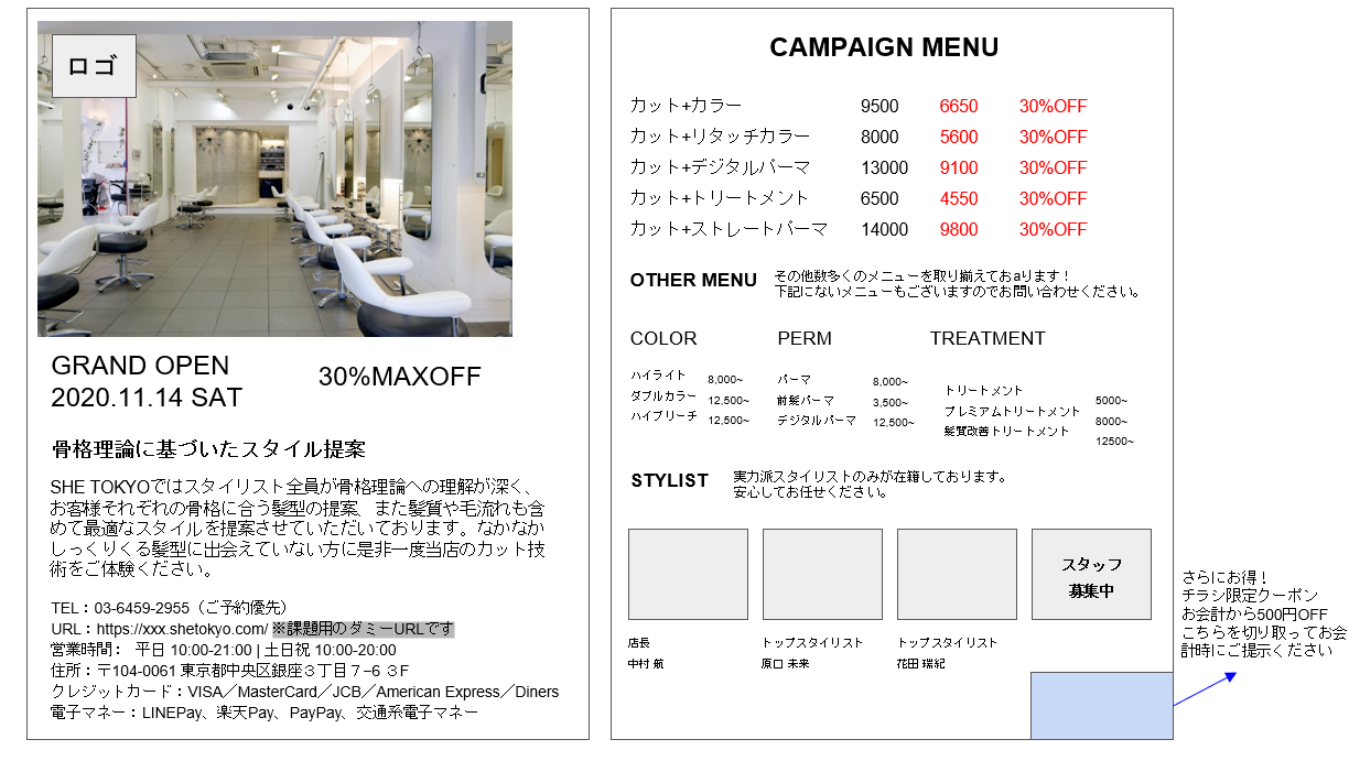 SHElikes MULTI CREATOR COURSEの課題で、骨格理論に基いたスタイル提案が売りの美容室の特別キャンペーンフライヤー制作に取組みました。(制作時間:17時間)