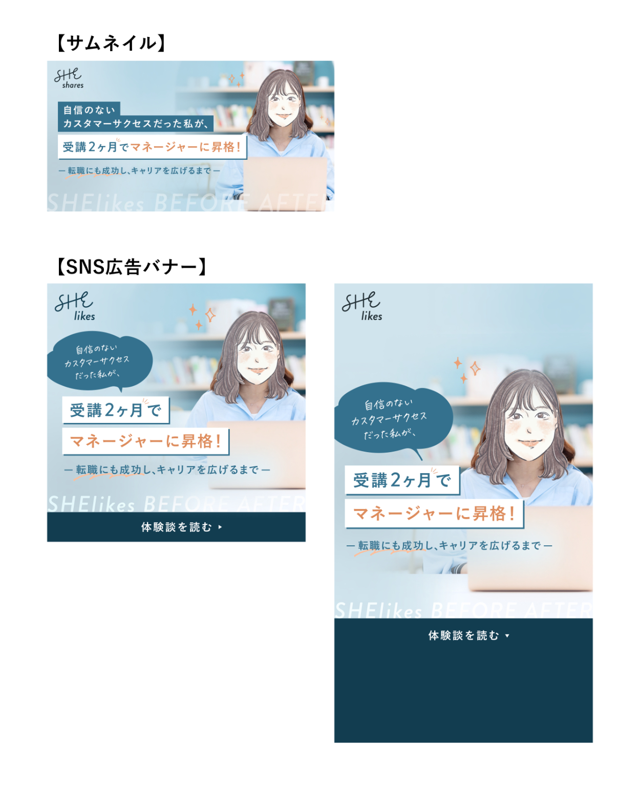 ・サブコピー(自信のない〜)の部分は、それぞれの形状に合わせ、サムネイルとSNS広告バナーでデザインを分けて対応しました。