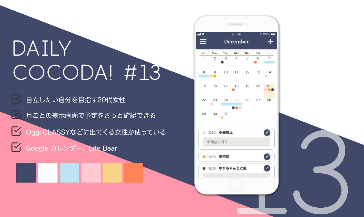 13日目はOggiやCLASSY読者がターゲットのカレンダーアプリ。