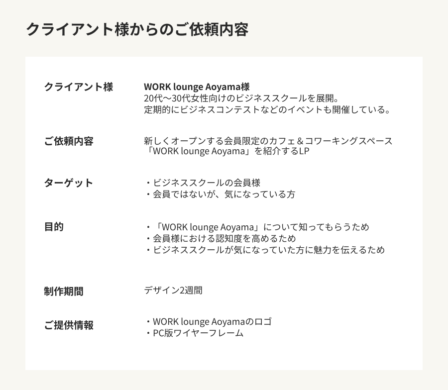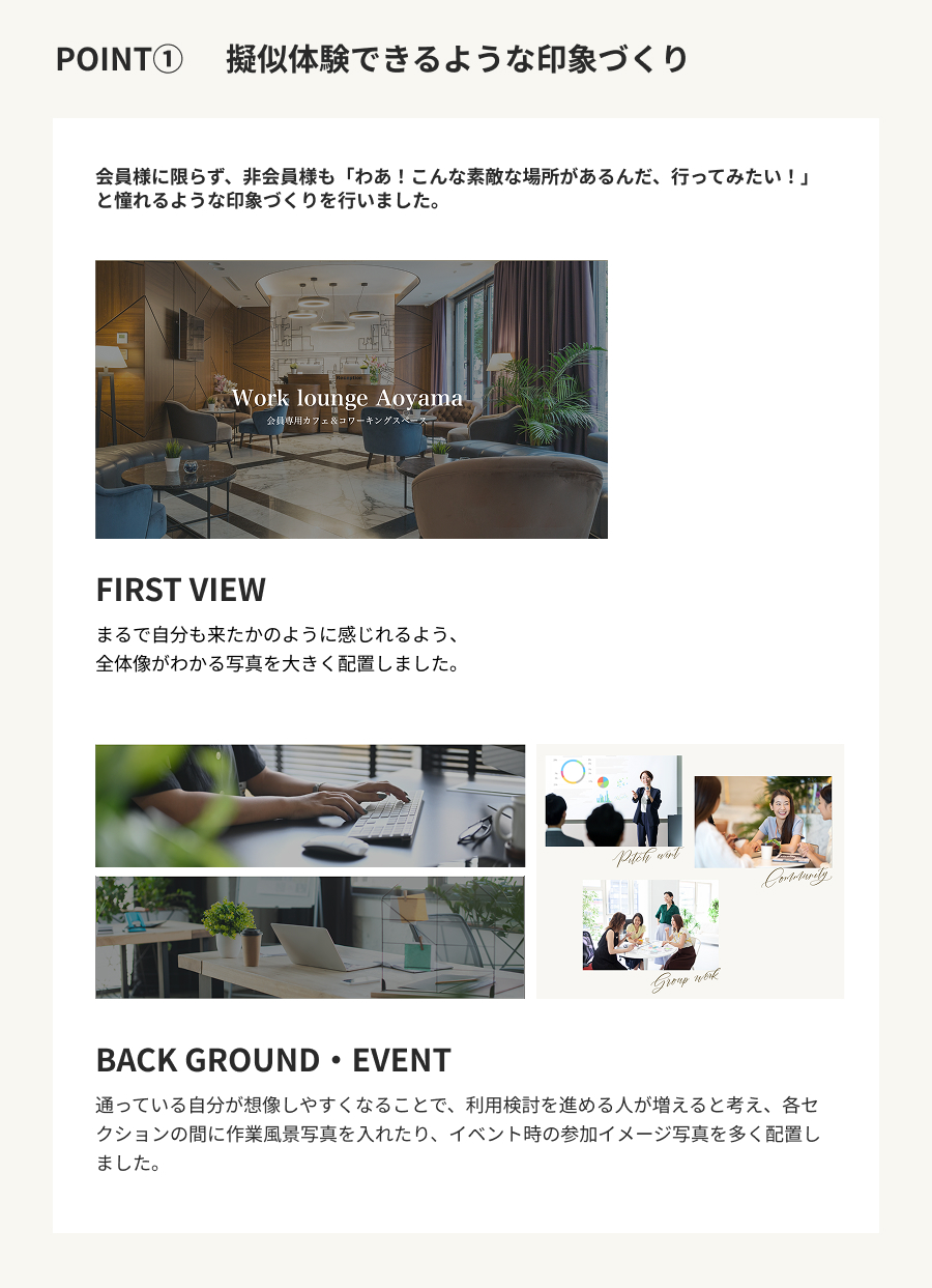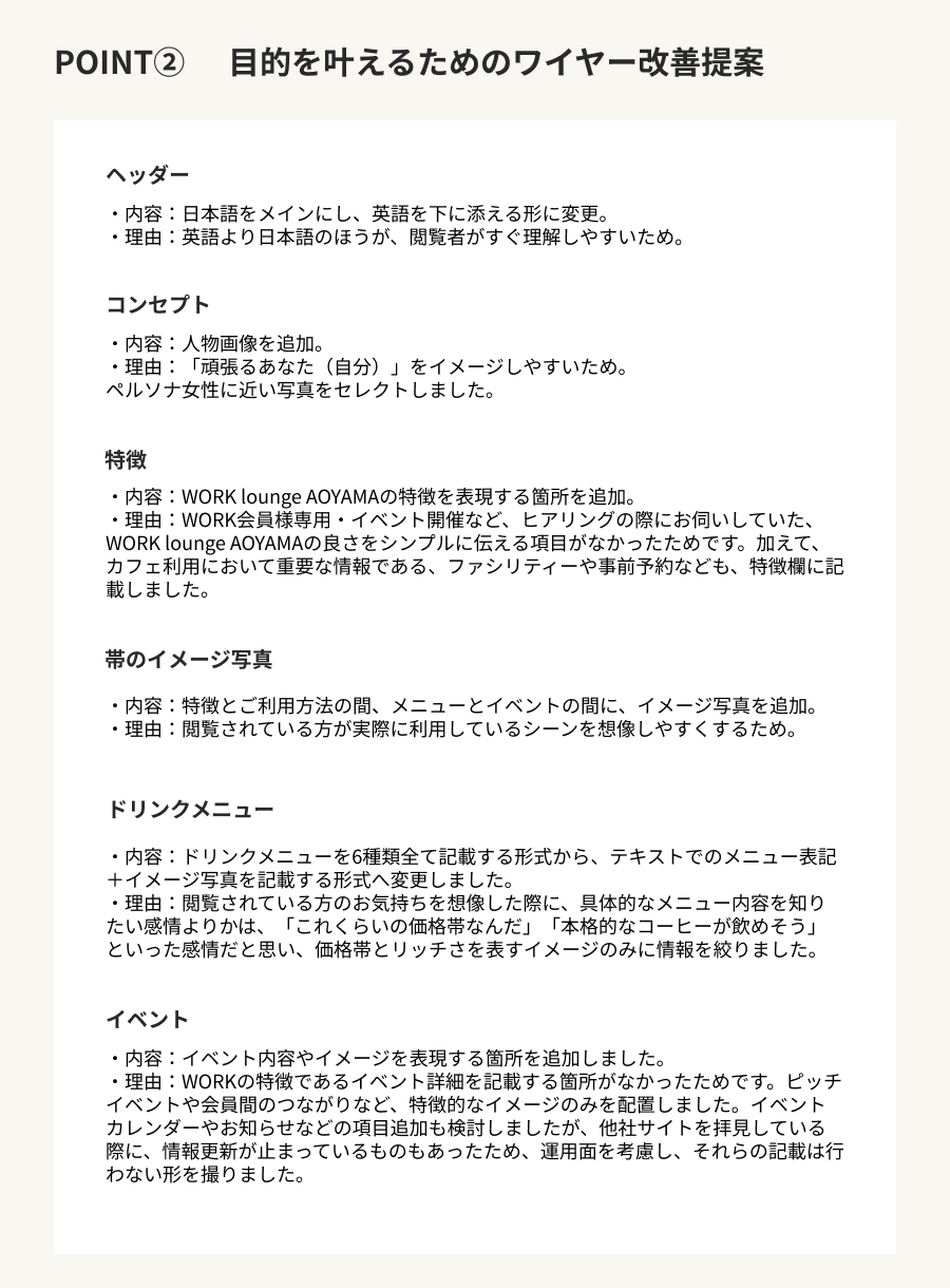 PCデザインカンプにおきましては、頂戴したワイヤーフレームをもとに制作いたしました。さらに目的を叶えるデザインを目指し、ワイヤーフレームからの改善提案も行わせていただいております。(以下POINT②に詳細記載あり)