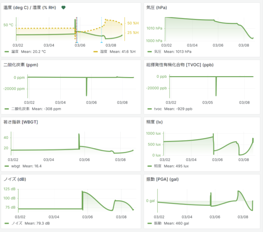 上記AWSの構成でセンサーデータをTimestreamに保存し、Managed Grafanaでグラフ化した。