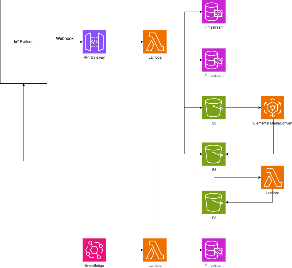 その他、MediaConvertのよる動画ファイルの変換(mov→mp4)、動画サムネイル画像の生成、定期的なLambda実行で機器のステータスを取得してTimestreamに保存などを実施。