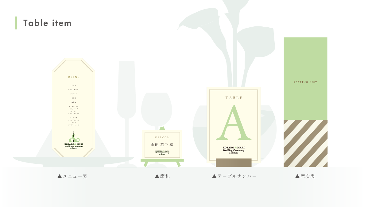 テーマに合わせ式場選択とウェディングアイテムのデザインを進めました。