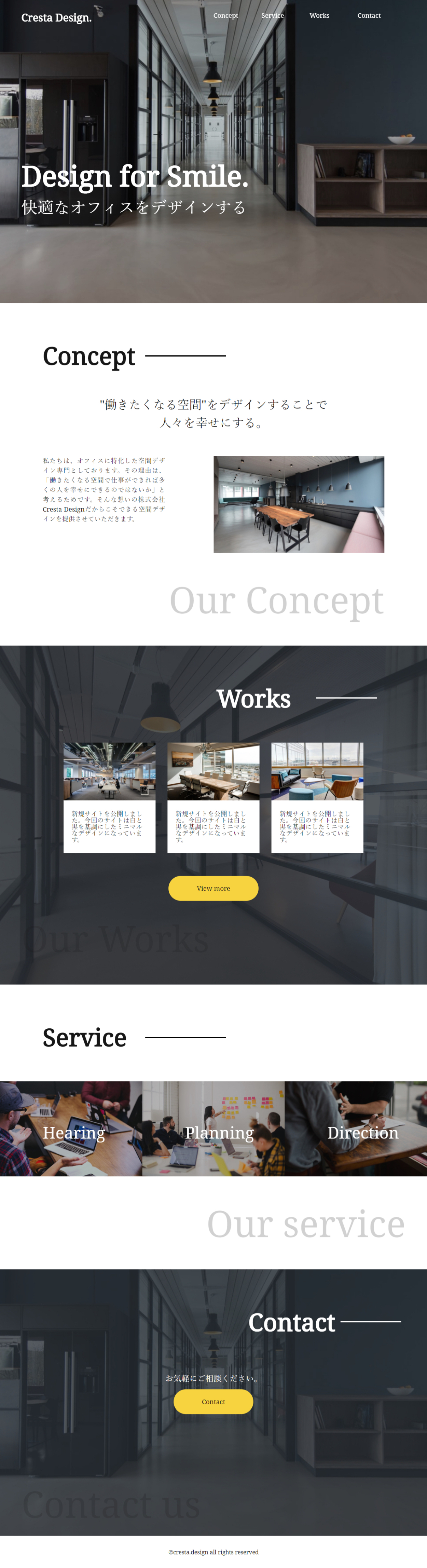 工夫点・気づき:XDのカンプデータからのコーディングです。カンプデータのpxを寸分違わず再現しました。Service部分の互い違いレイアウトをorderプロパティでスタイルを当てました。今までcolumn-reverseで当てていたためorderのほうがスタイルの自由度があがり使いやすいと個人的には感じました。