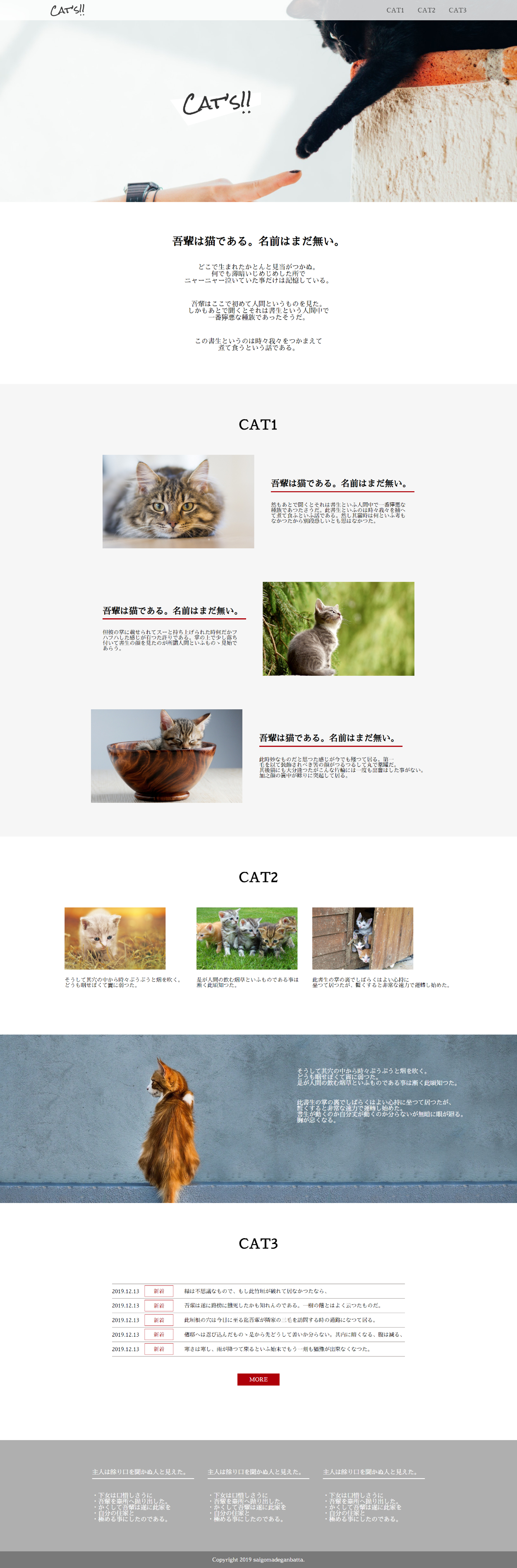 工夫点・気づき:ヘッダーメニューをfixedで固定し、表示をしました。CAT3セクションのボーダーのスタイルをnot:でスタイルを当てました。