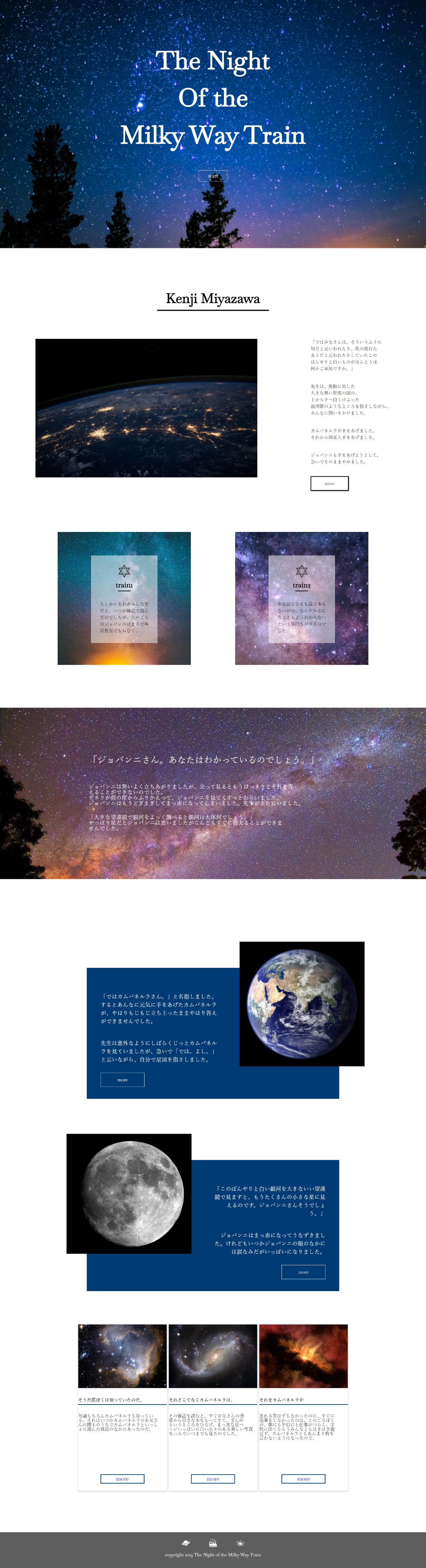 工夫点・気づき:サイトのデザインをする前に参考サイトを30サイト見ました。やはり縦書きで表現しているサイトがほとんどだったため導入致しました。