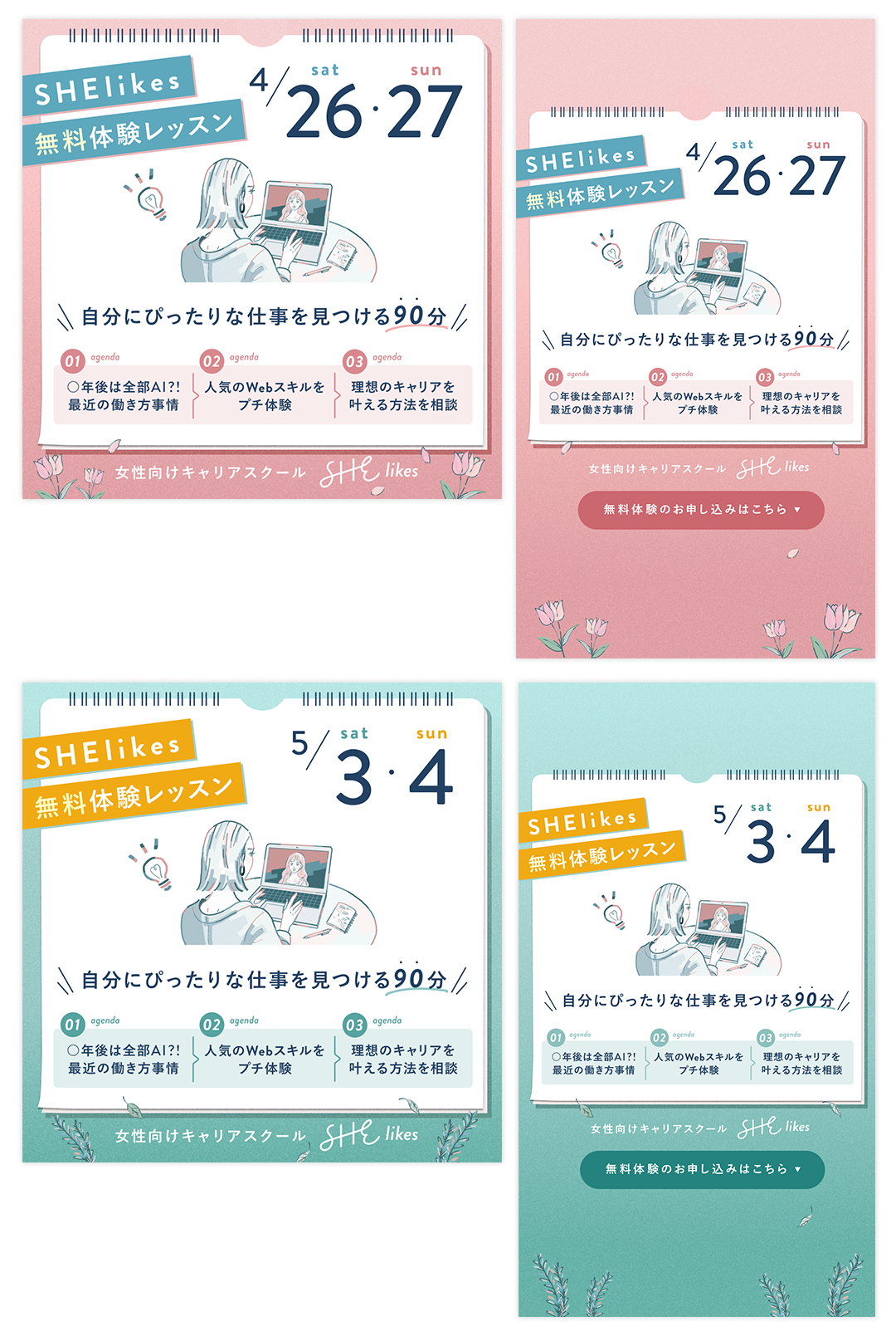 - 体験レッスンの日付に合わせて4月と5月で季節感を感じられる配色で仕上げました。