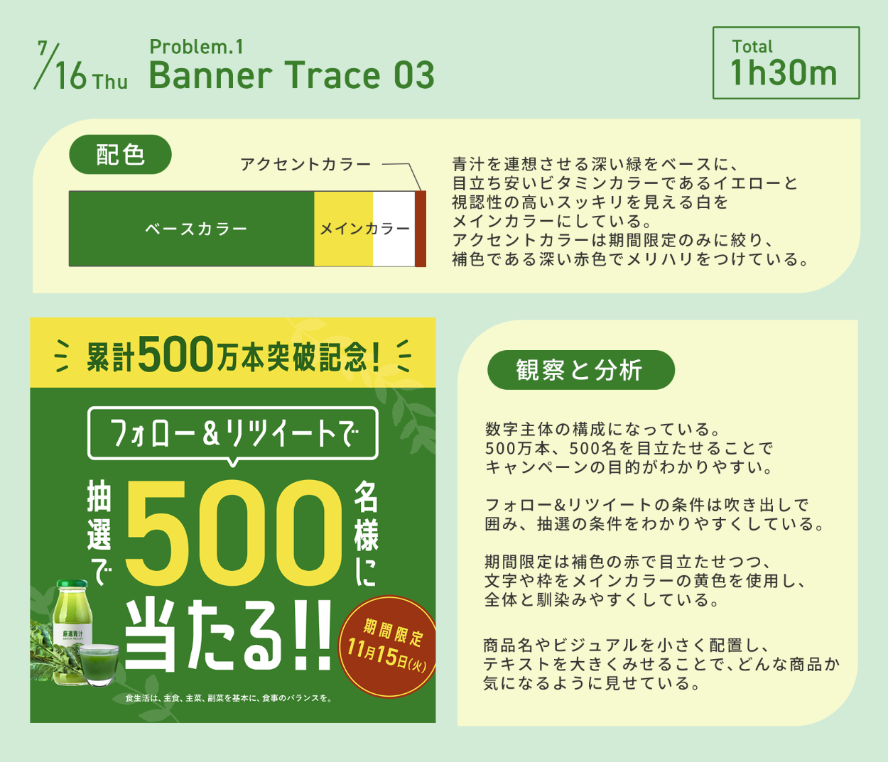 今回バナートレースを行うことで、テキストメインの情報優先度の見せ方について学びを得ることができました。私は、文字の強調には大きく又は太くのイメージを強くもっていたこともあり、フォントが細く小さくても吹き出しや装飾、配置で十分伝えることができるのは新たな発見でした。