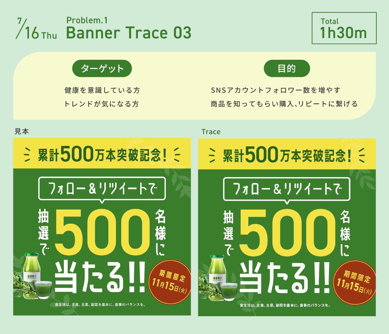 - 背景の緑と「累計500万本…」の色味は同じ色だと思っていましたが、実際にトレースしてみると文字色がぼやけて印象が薄くみえてしまいました。、同じ色でも使用する面積によっては見え方が変わってしまうため、少し濃くするなどの調整が必要であることを学びました。