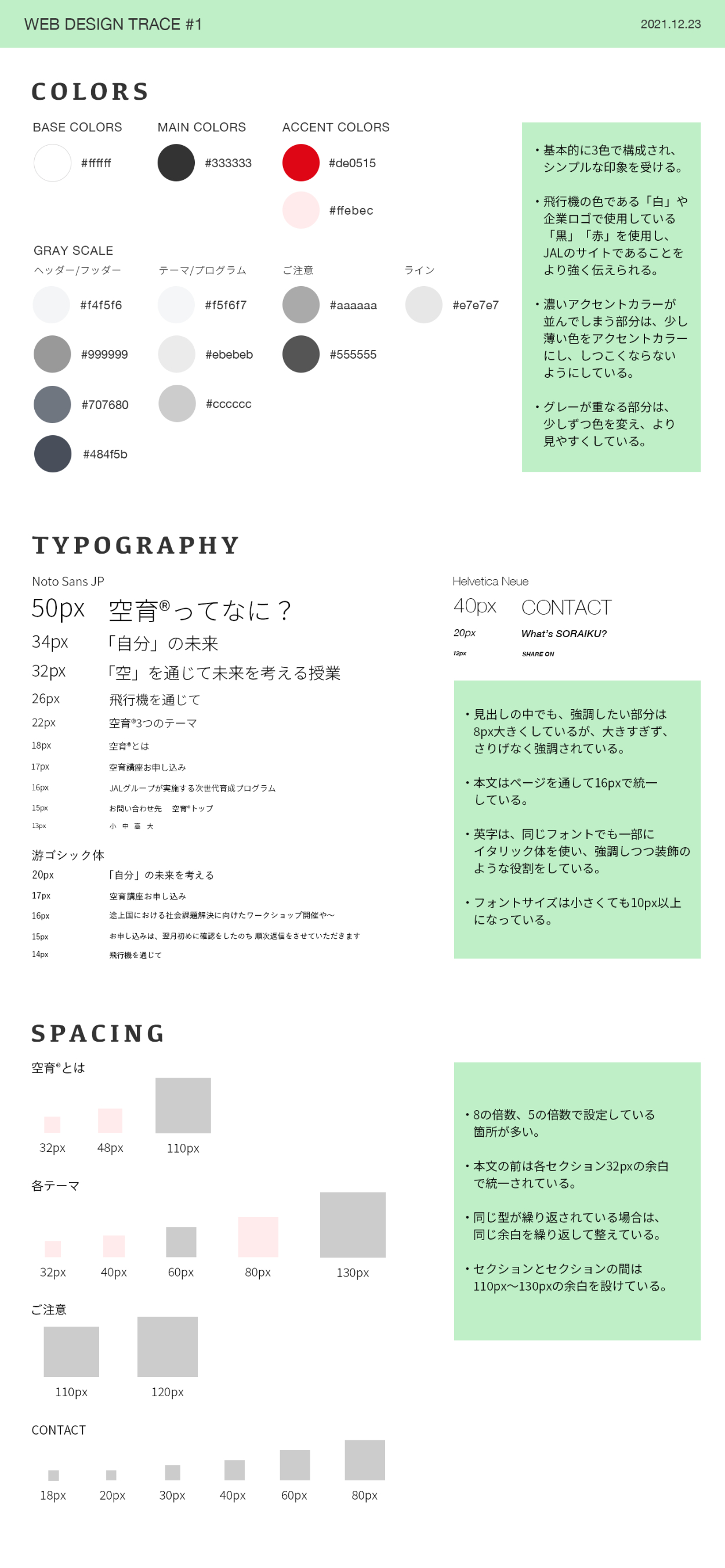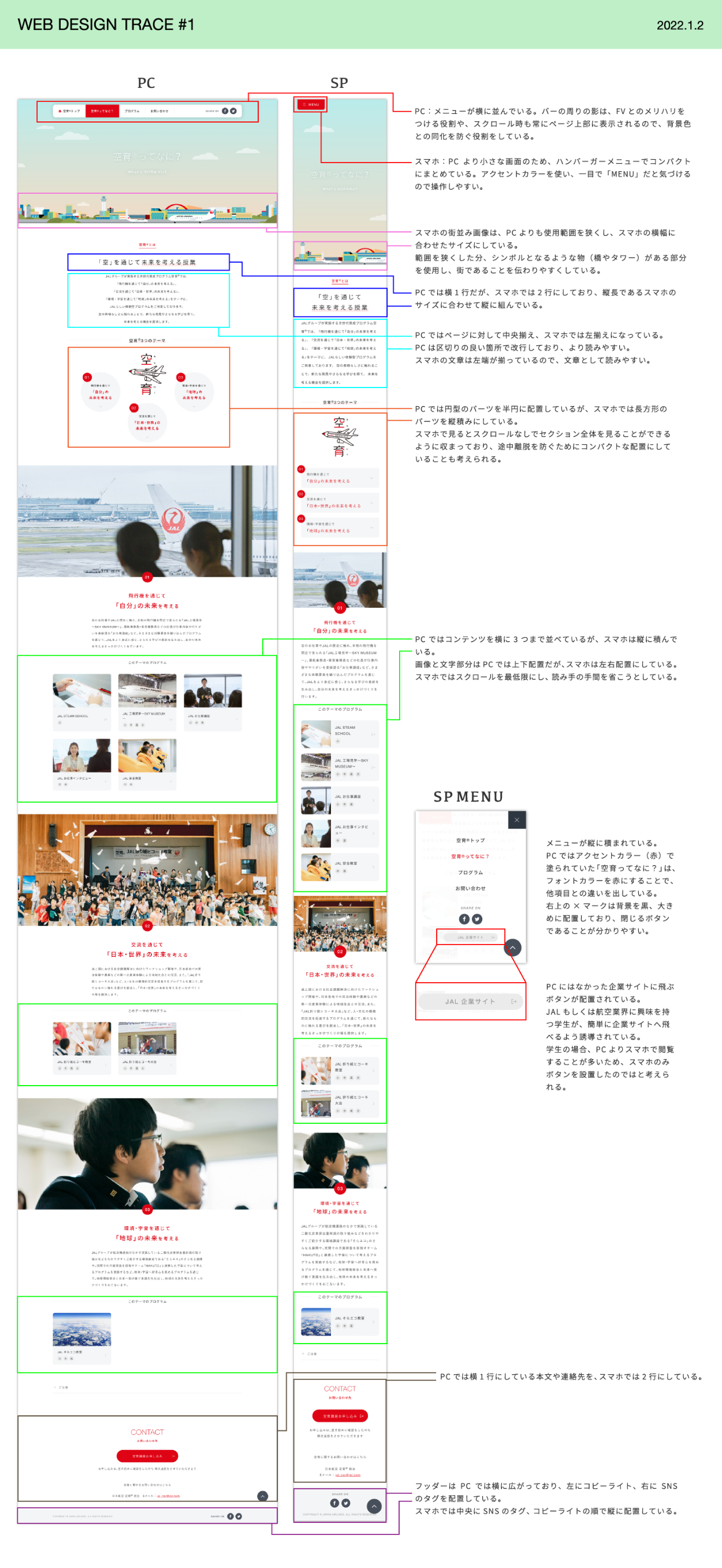 SHElikes MULTI CREATOR COURSE の課題で、Webページのトレースに取り組みました。また、スタイルガイドとPC/SPのレイアウトの違いをまとめました。(使用ツール : Illustrator)