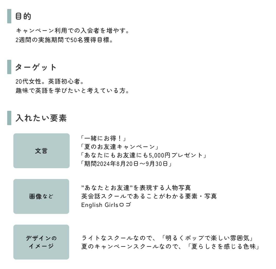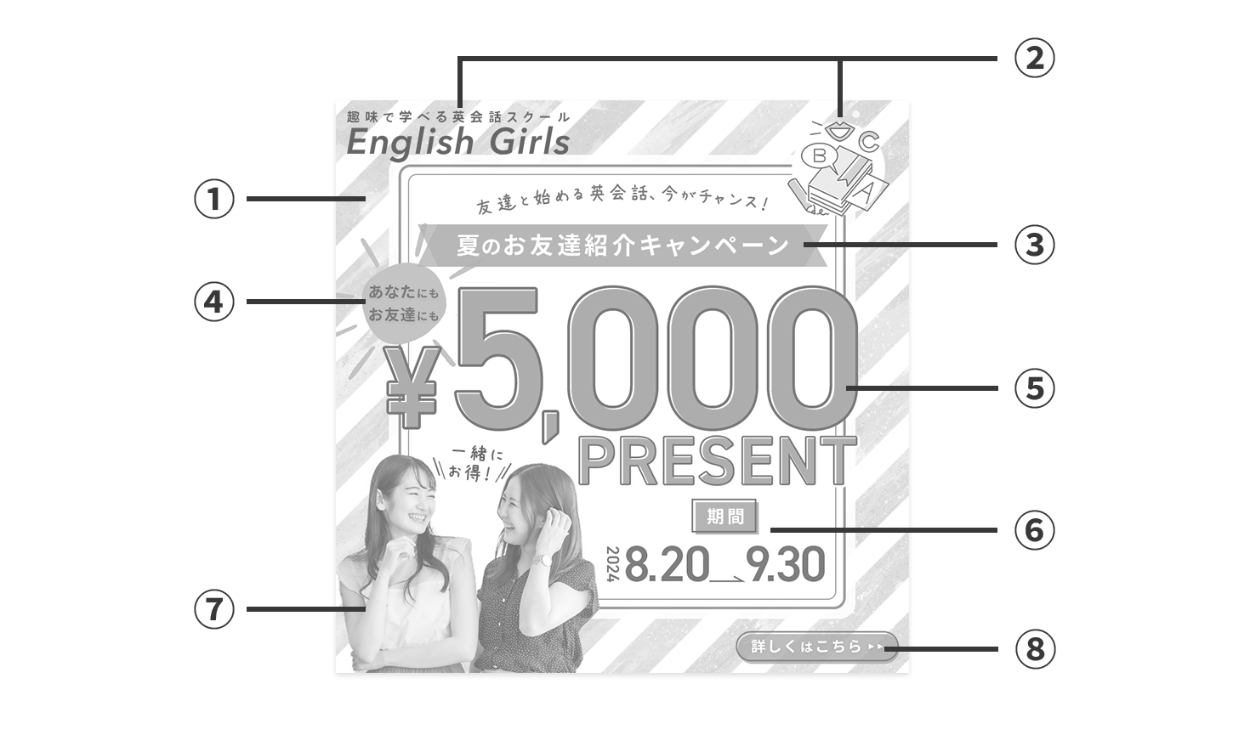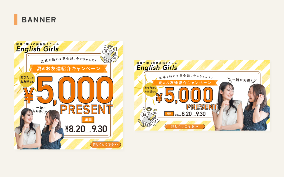 キャンペーン名をリボンで強調。その上部に、「友達と始める英会話、今がチャンス!」を手書きフォントで追加して、気軽に始められることをアピールしました。