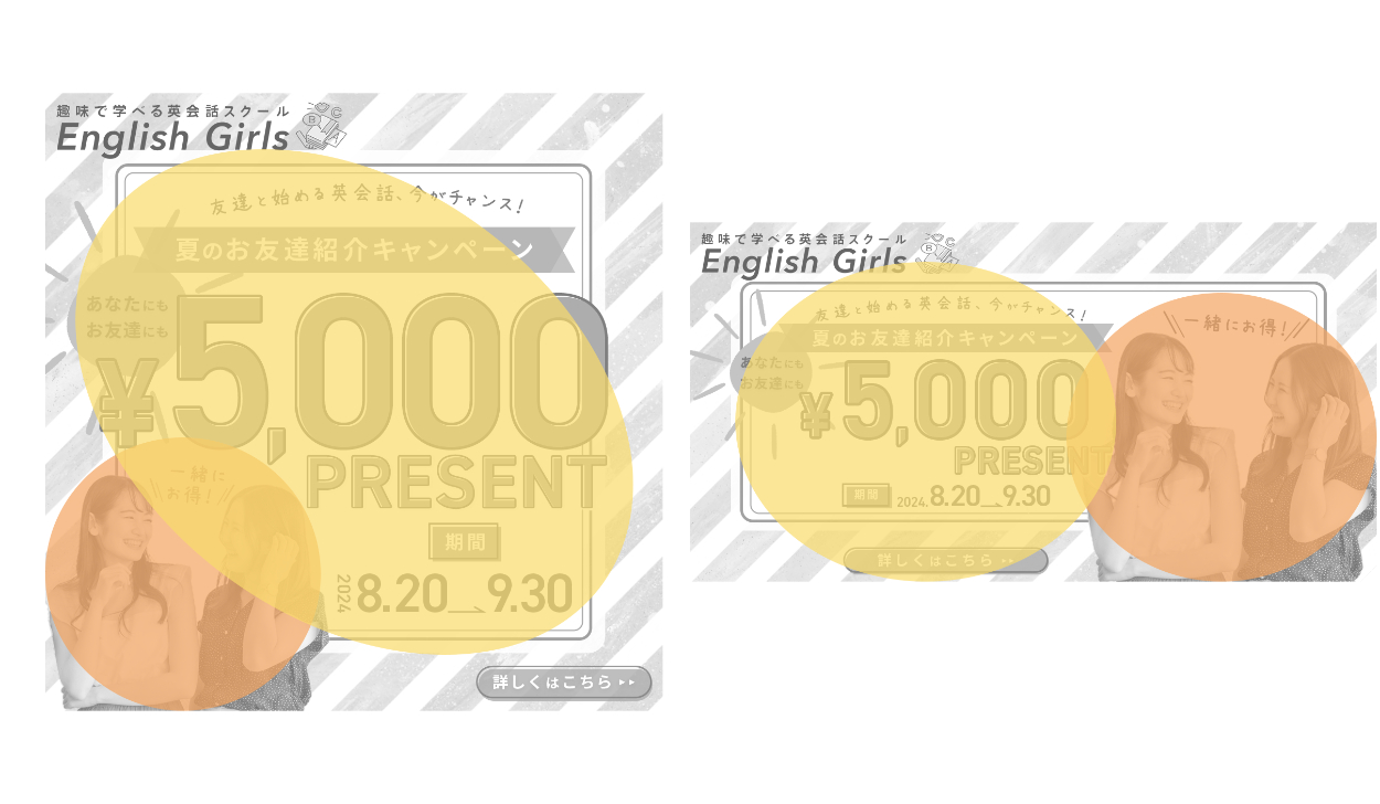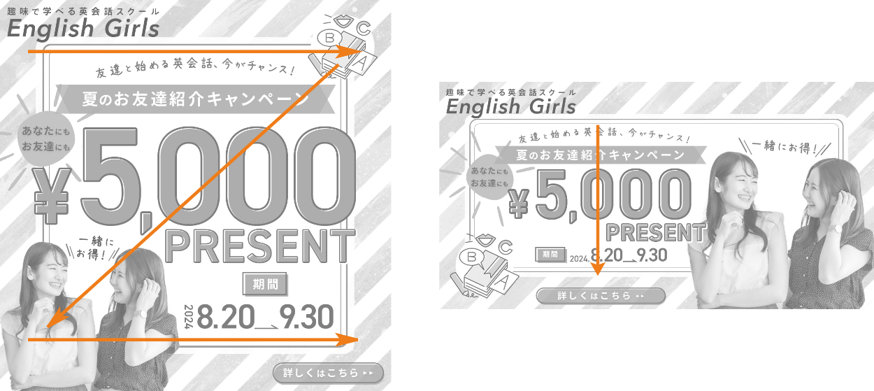 「¥5,000PRESENT」と同色(メインカラー)を用いて、視線の流れを意識して配置しました。